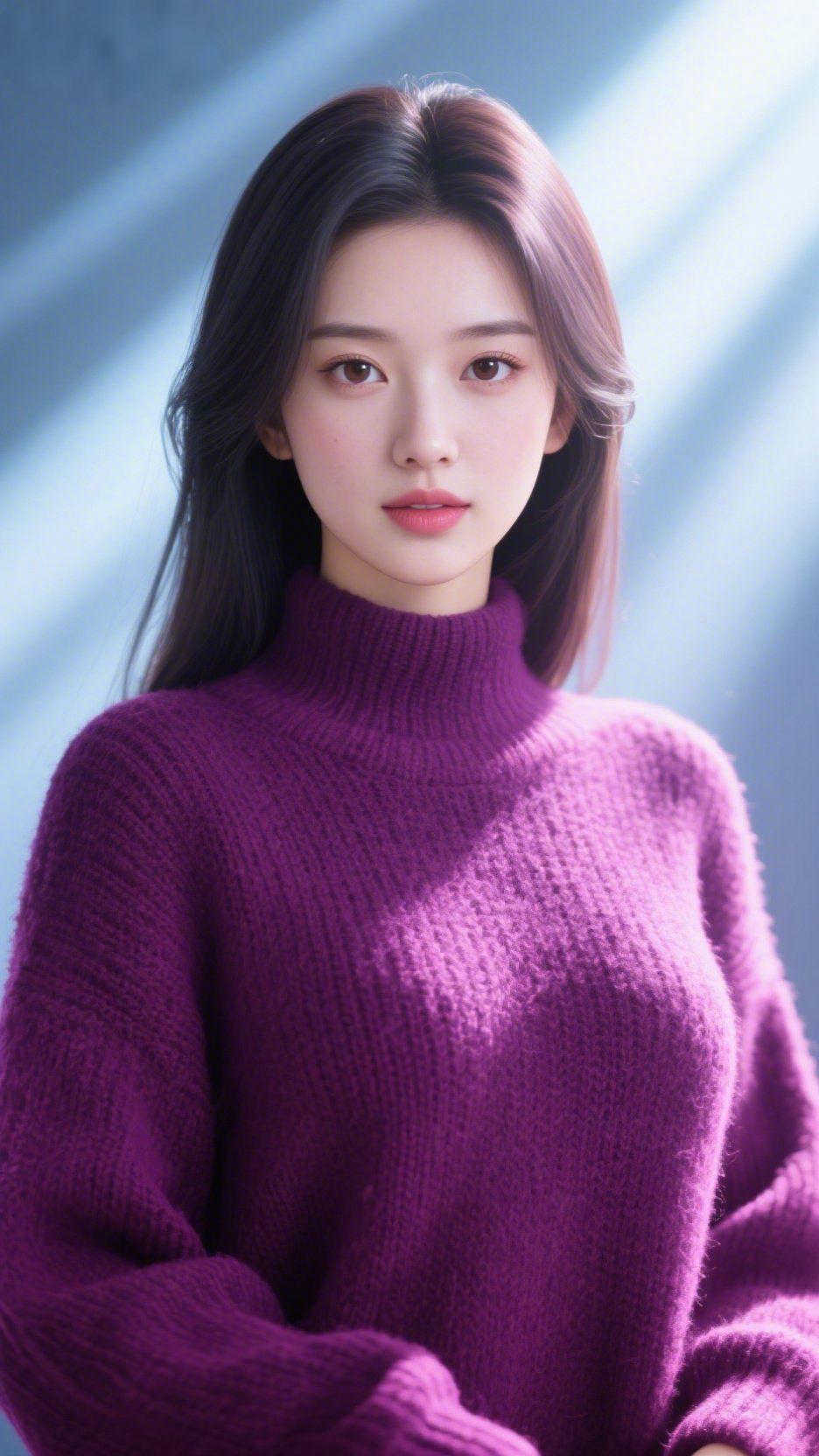 紫绒柔光 浅灰底色里,几缕光斜斜铺展,落在紫绒毛衣的针脚间——像把暮秋的深紫揉进绒线,每道纹理都裹着软暖的质感。 长发轻垂过肩,高领绒衫衬得轮廓温静,唇色是淡而匀的粉,和周身的光融成了软和的调。光在绒面上漫开细闪,连空气都浸着蓬松的暖意。 她只是安静立在那里,这抹紫便成了冷调里的温柔落点——像某个松弛的午后,风轻得没声息,光软得裹住肩,身上的绒衫也揣着妥帖的安稳。 紫绒暖感 柔调穿搭