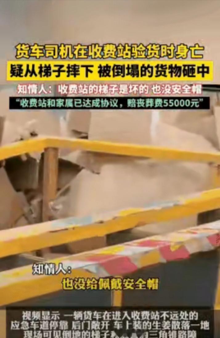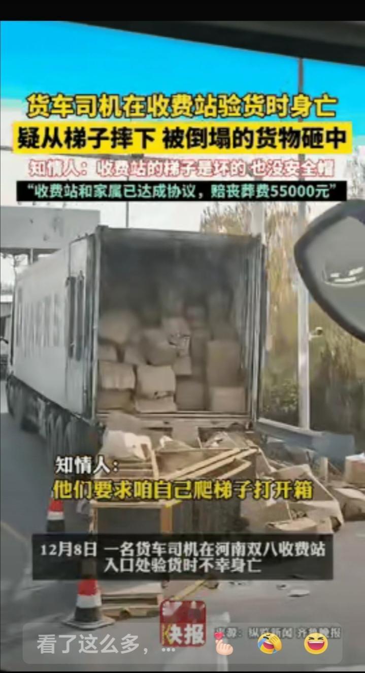 河南商丘双八收费站悲剧:坏梯无防护,货车司机查货时不幸殒命 河南商丘梁园区双八收费站,本应是车流顺畅的通行节点,12月6日下午却因一场违规查验酿成致命悲剧。山东聊城籍货车司机驾驶满载生姜的货车,沿鲜活农产品“绿色通道”前往潍坊安丘,在此处被要求登车开箱查验,未曾想这一常规要求竟成生命终点。 据知情人士透露,收费站工作人员要求司机自行攀上超2米高的移动梯子,挪动货箱配合摄像头拍摄查验。这辆梯子的梯脚固定扣早已损坏,轮子无法锁死,属于明显的故障设备。更令人揪心的是,现场工作人员均佩戴安全帽,却未给司机提供任何防护装备,也无一人上前扶稳梯子。司机曾试图沟通,告知货物未装满易倾斜倒塌,但未获理会。当他搬至第四箱货物时,失衡的货箱带动摇晃的梯子猛然倾斜,司机随货物一同摔落,最终不幸身亡。 事件曝光后,网友热议如潮。“查验是工作人员的职责,凭什么让司机冒险高空作业?”“坏梯子+无防护+无人监护,这不是让司机去闯鬼门关吗?”有货车司机网友吐槽:“高栏货车动辄两三米高,拆篷布、搬货物本就费力,安全责任怎能甩给司机?” 法律层面早已明确权责边界。依据《高处作业分级》标准,2米以上作业即属高空作业,需配备完整防护设施与专人监护。公益律师赵良善指出,收费站作为查验组织方,负有法定安全保障义务,提供合格设备、防护装备及专人协作是基本要求。同时,行政检查相关规定明确,执法人员需不少于两人协作,全程保障被检查方安全。 目前收费站已与家属达成5.5万元丧葬费协议,但后续司法程序仍将追究相关方责任。这场悲剧也敲响警钟:“绿色通道”的查验效率,绝不能以牺牲司乘安全为代价,科技查验与规范流程才是避免悲剧的关键。高速连环事故 高速意外事件 红绿灯口车祸