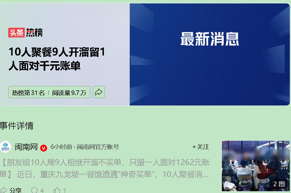 这哪是朋友吃饭,简直是人品试炼场!十个人吃饭,九个溜得比谁都快,留一个冤大头对着1262块的账单发呆。绝了,签了字押了证,第二天还能反悔?今天就把话说明白:字是你签的,这钱你就得认! 我是真服了。老板报警时得多憋屈?警察打电话给组局的,那头居然说“我也没钱,得凑”。好家伙,十个人凑不出一份担当?这不就是看准了店家和小张好说话,纯欺负老实人! 为什么那九个敢跑?说白了,赌的就是法不责众,赌你会认栽。但律师讲得很清楚:承诺书一签,你和饭店的账就清了。至于你跟你朋友之间谁请客、怎么A,那是你们自己的破事儿,跟人家饭店有半毛钱关系?自己内部谈崩了,就让无辜的饭店吃亏?没这个道理。 跟那位张先生说两句:别觉得委屈。当时警察在场,你签字押证没人逼你。成年人了,白纸黑字就是契约。觉得被朋友坑了?付完钱,拿着账单去找他们挨个要!不敢找朋友只敢对饭店反悔,这不就是挑软柿子捏吗? 也给开饭店的提个醒:遇上这种一大帮人、关系看起来就不太熟的,多留个心眼。点菜时客气提醒一下大概消费,感觉苗头不对,可以试着让组织的人付个定金。不是把人想坏,是保护自己的辛苦钱。 这事儿真是一面镜子。那些遇事就躲、有锅就甩的“朋友”,早点看清也好。咱们自己也想想,要是碰上这种局,是该死要面子活受罪,还是吃饭前就把“钱怎么算”说清楚? 说到底,规则就是规则。饭店做了菜,就该收钱。你签了字,就该付账。那些溜走的人,欠的不只是126块钱,更是一份做人的底线。这钱就该硬气追到底,让所有人知道:信用不是玩笑,谁糟蹋谁买单。