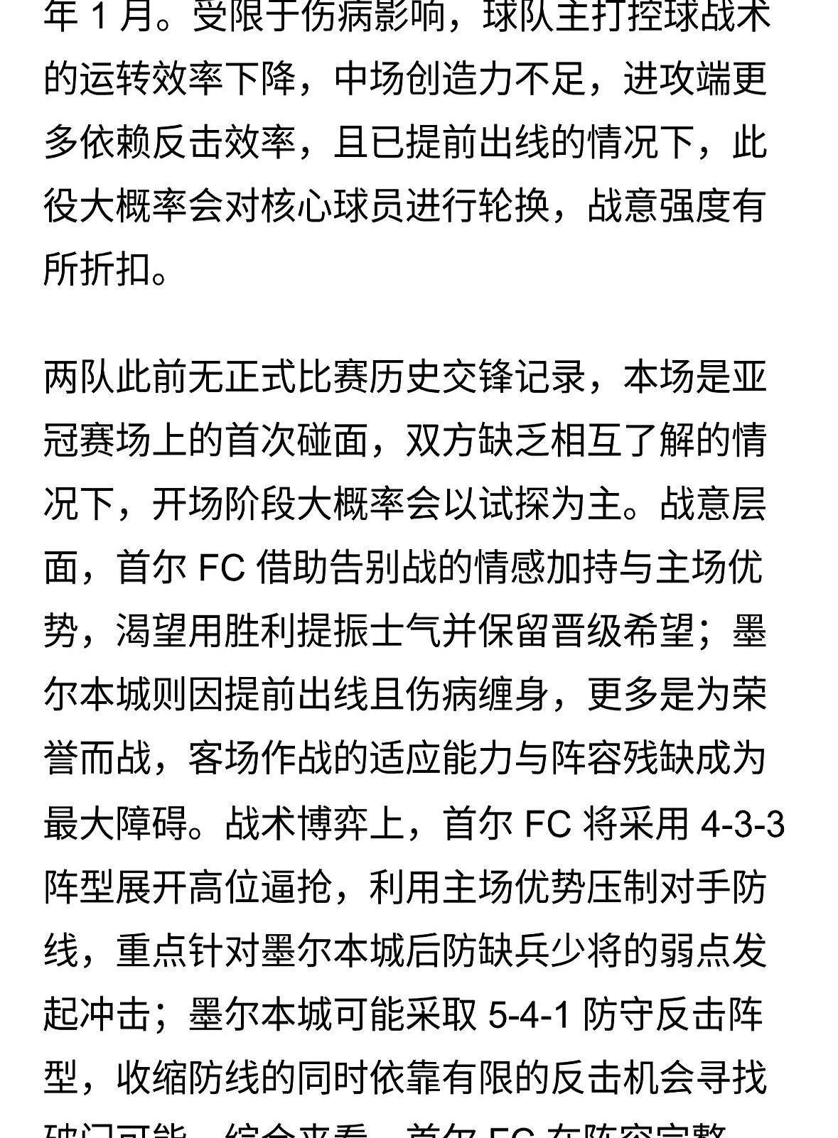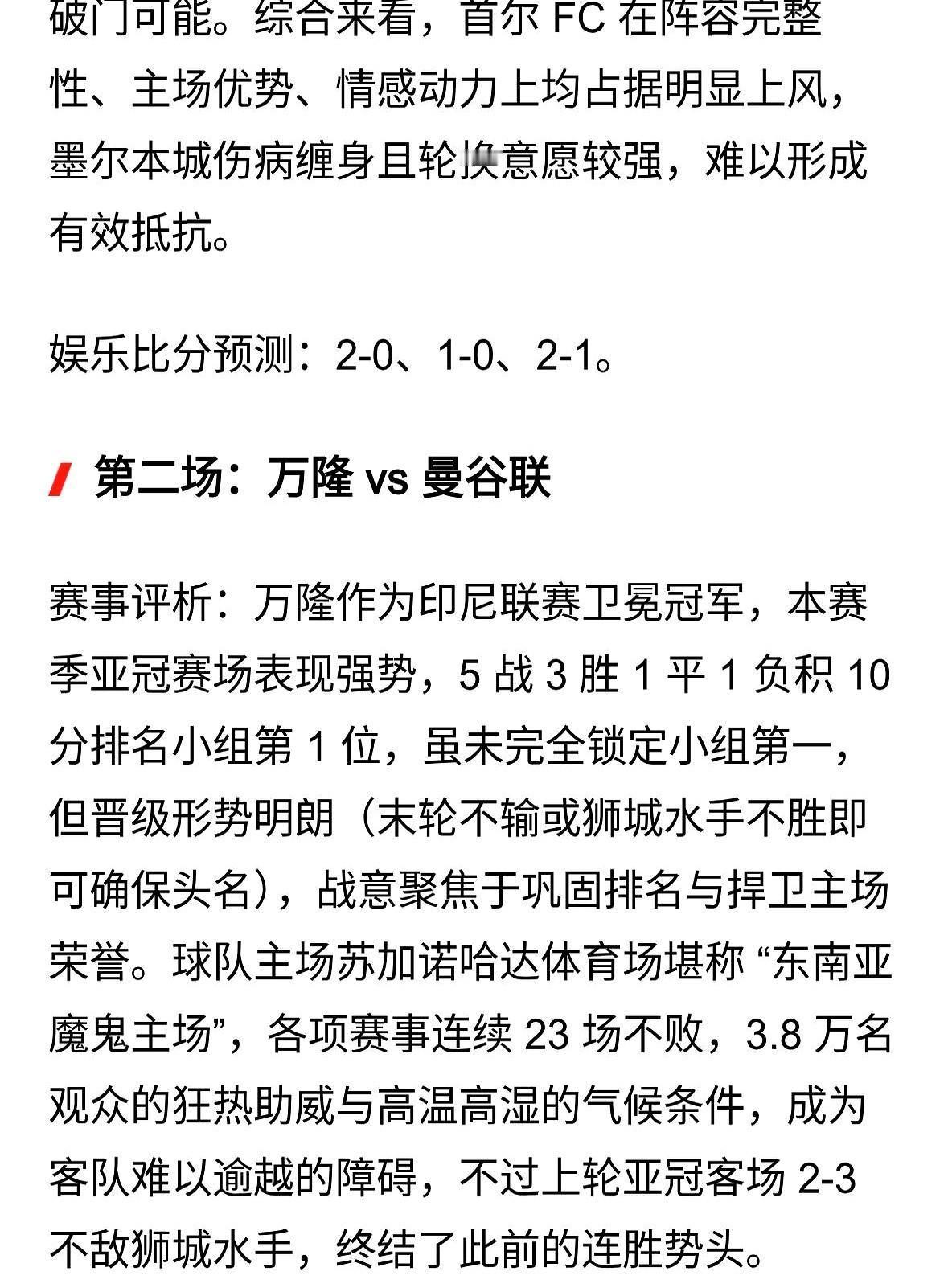 赛前猜的,准了一半。 但有些结果,比编的剧本还刺激。 尤其是那几个关键球,看得人攥拳头。 首尔FC主场最后十分钟,曹永旭拿球往禁区切。 墨尔本城后卫伸脚想拦,他轻轻一扣左脚抽射死角。 球进瞬间,看台上红围巾全甩成浪——这制胜球够吹一周。 万隆的席尔瓦刚用头球顶成2-1,曼谷联提拉通就从边路冲来。 带球连过两人传中,队友头球蹭进门窝——补时绝平! 替补席都跳起来拍广告牌。 雪兰莪的贝格松状态真烫,接直塞单刀推远角。 狮城水手后卫追都追不上,后防线漏洞又被戳中。 预测这玩意儿,就是图个乐。 到场上球员拼起来,啥纪录都不好使。 席尔瓦梅开二度又怎样? 曼谷联照样绝平。 贝格松这状态,谁能拦得住? 你们觉得下一轮,哪队最可能爆冷? 来聊聊呗~