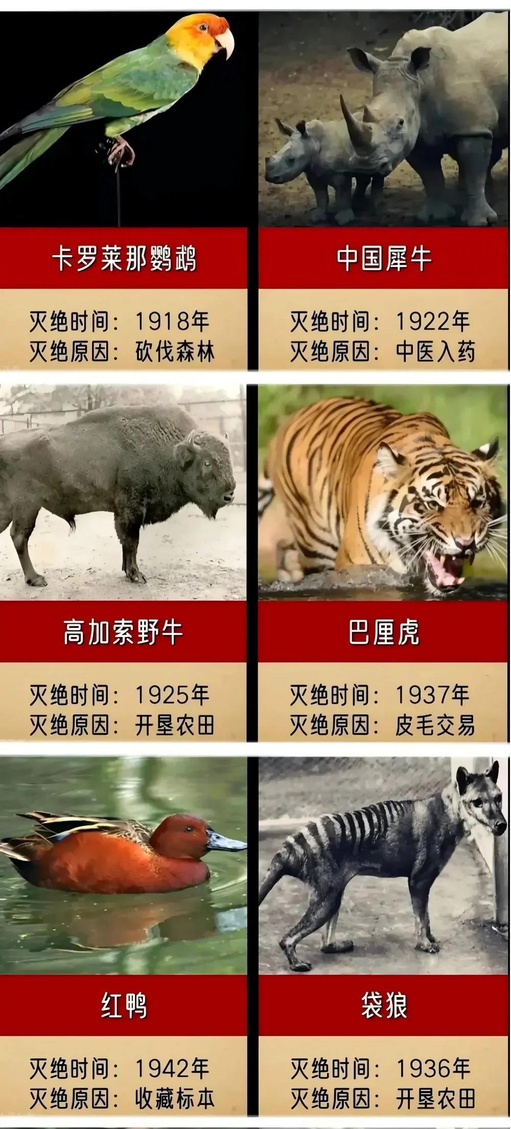 斑 驴:1883年灭绝了。 袋 狼:1936年灭绝了。 巴厘虎:1937年灭绝了。 其中有陆地生物,也有海洋生物,还有鸟类……可以说是陆海空都包含了。理论上物种的灭绝也是自然规律,正所谓适者生存,正如曾经统治过地球1.6亿年的恐龙一样,最终还是灭绝了。但是我们仔细看看这十种动物灭绝的原因,要么是猎杀,要么是因为人类破坏环境,所以他们并不是自然灭绝,而是人为制造。如今人类文明又进入了一个新的时代,世界各国都开始注重生态环境保护,希望以后再也不要有物种灭绝。