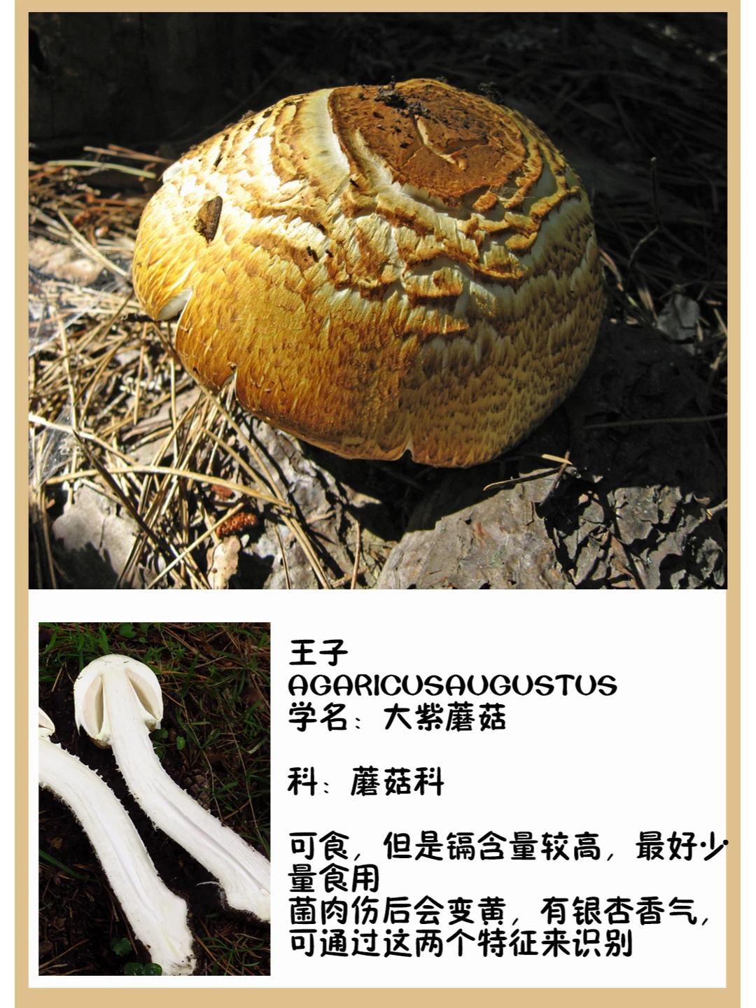 王子 Agaricusaugustus 学名:大紫蘑菇 科:蘑菇科 图片©manatarka.org ©josef hlasek 可食,但是镉含量较高,最好少量食用[doge] 菌肉伤后会变黄,有银杏香气,可通过这两个特征来识别