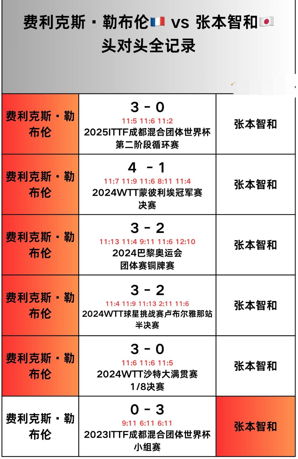 张本智和与小勒布伦的头对头全记录 WTT香港总决赛1/4对阵 张本张本VS小勒布伦! 从以往的交手记录来看, 小勒布伦对阵张本, 5胜一负, 有绝对优势赢张本! 如果小布晋级四强, 就会对上林诗栋, 林诗栋真难啊! 感觉林诗栋不管拼小布还是拼张本, 都有困难, 但相信林诗栋也想过这一关, 总得面对, 林诗栋要多准备几板, 还要应对小勒布伦的不断变化, 小布最近涨球厉害啊! 小石头加油! 向鹏加油!