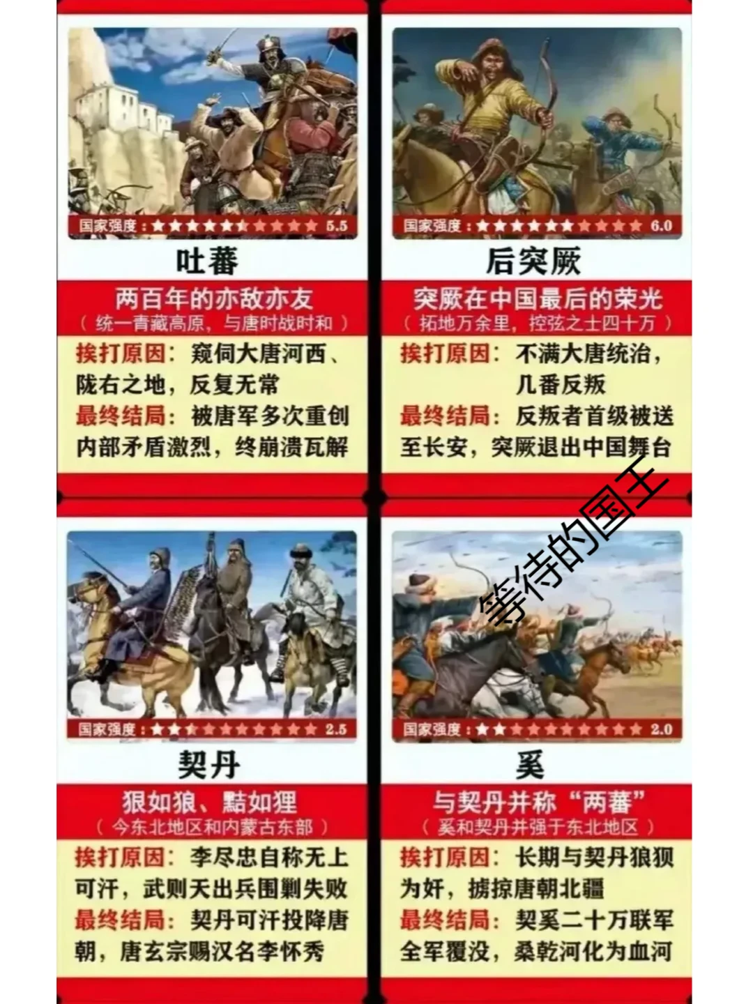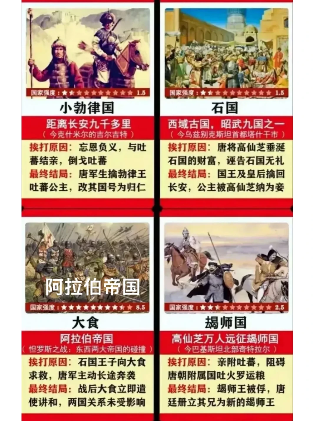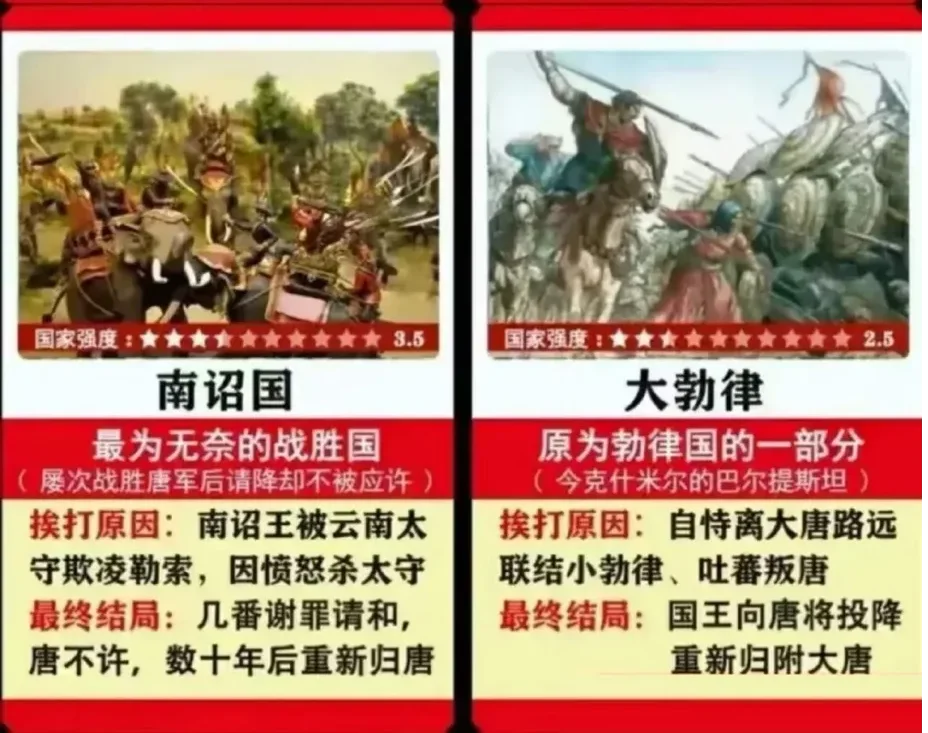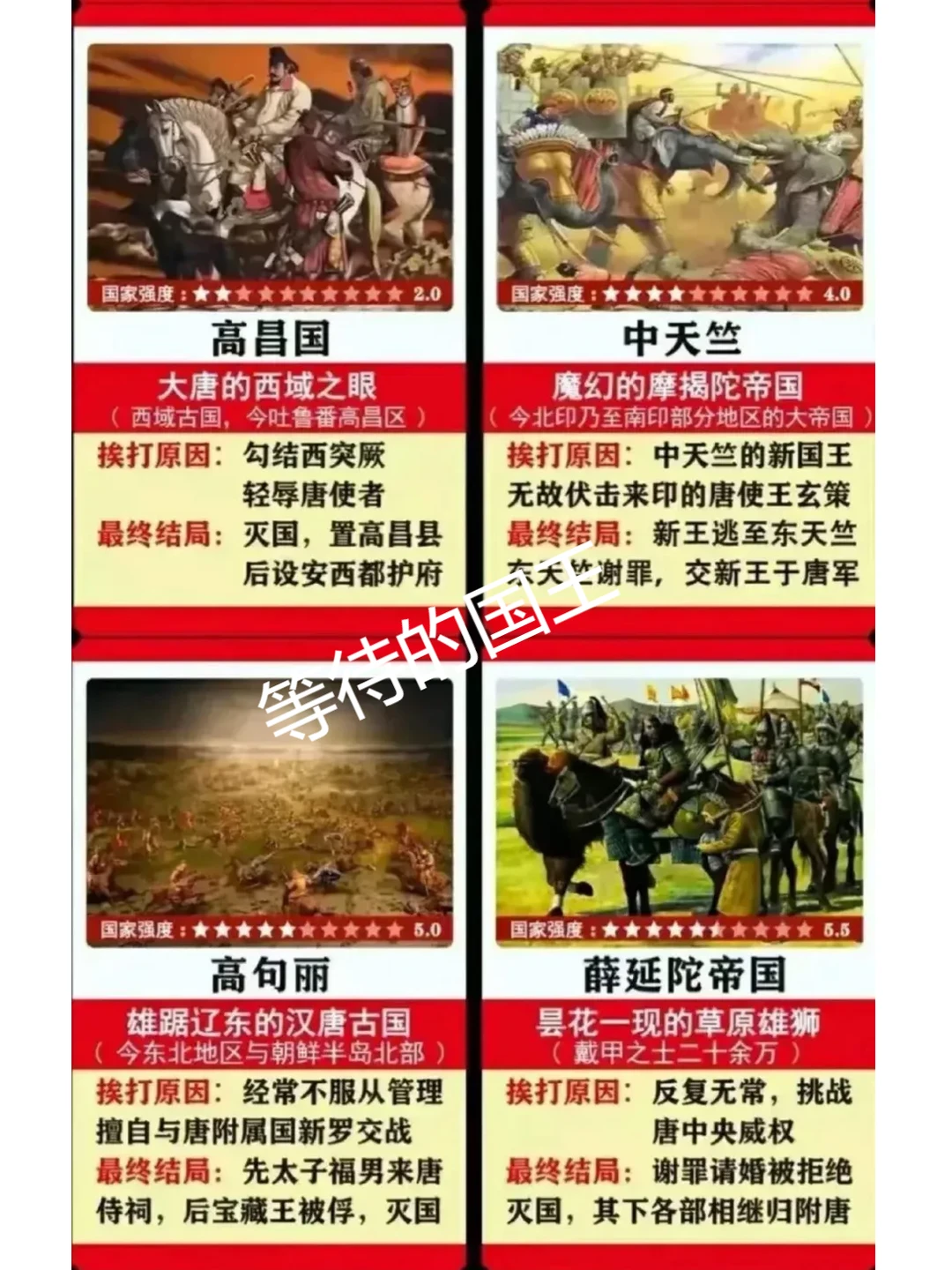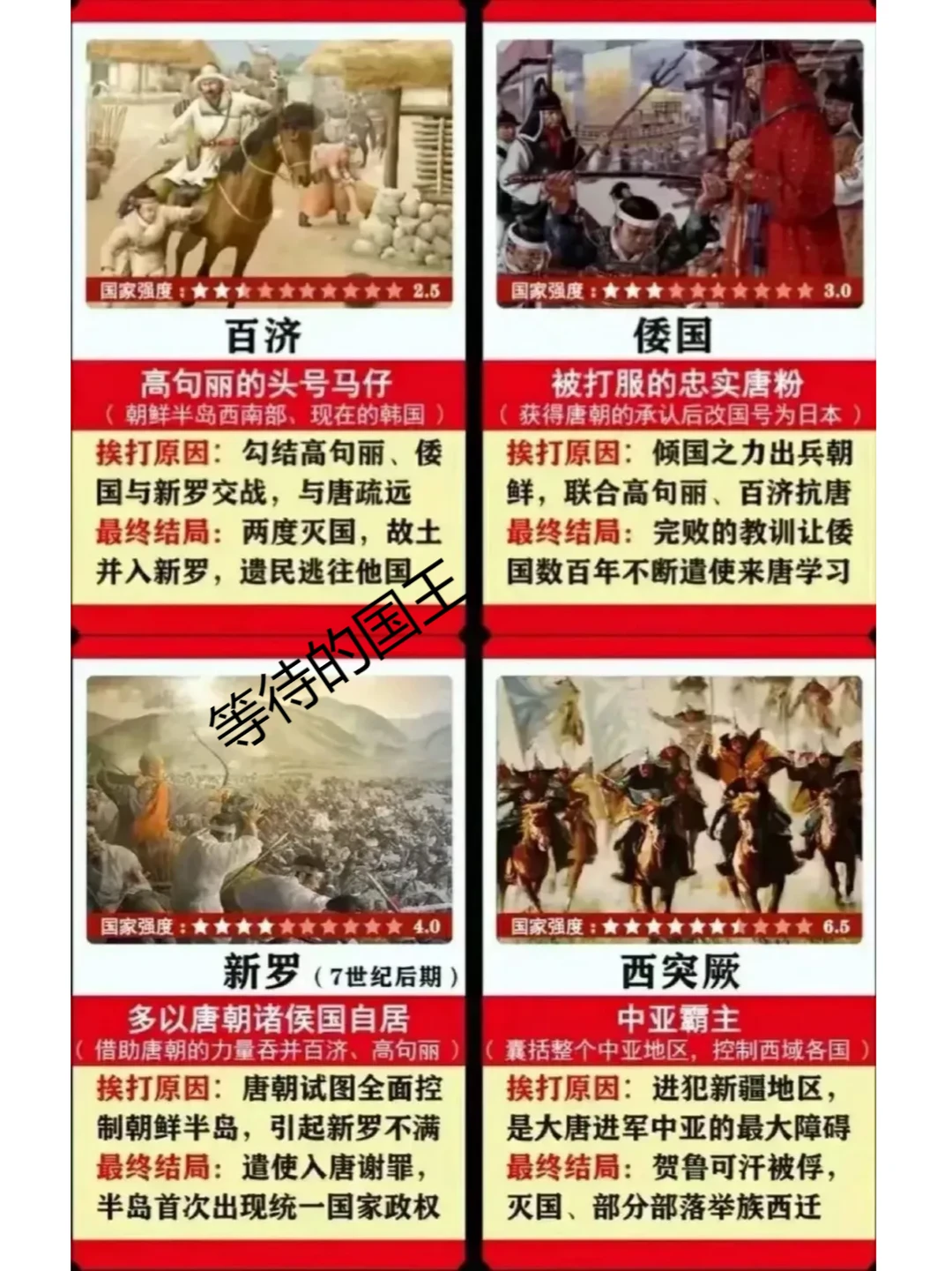如图所示,被唐朝打败和灭掉的20个国家一览图。其中不仅有与我们现在接邻的朝鲜、乌兹别克斯坦、巴基斯坦等国家,还有日本、阿拉伯等非接邻的国家。通过这些战争,不仅获得了他们的尊重,他们还年年进贡,并尊称唐朝皇帝为“天可汗”,当更换国王时,还要请“天可汗”赐封。从这也可以看出,尊严是打出来的,就如同1950年我们出兵朝鲜,打败了美英法等17国联军一样,战后国际地位不减反增,并获得了美欧国家的一致尊重。