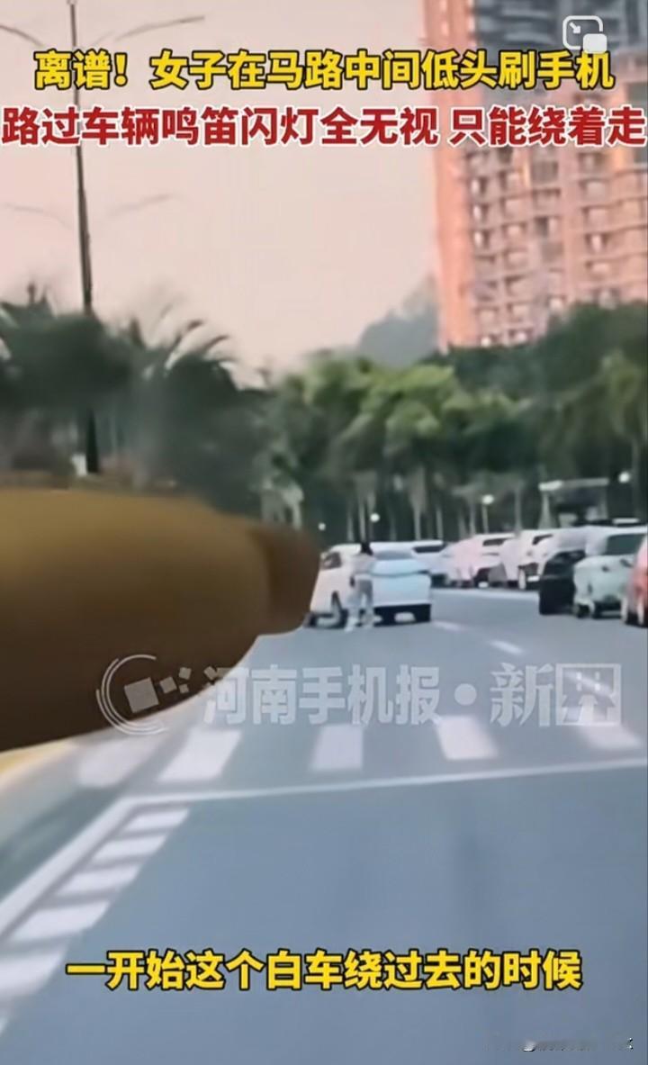 这种女人得治!女子站在马路中间低头刷手机,路过车辆呜笛闪灯全无视,纷纷绕路走。网友:第一次见等死的人。 12月6日,广东珠海,一名女司机气愤不已,将行车录像公于网上。 一名穿条纹衣女子站在马路中央,若无其事地刷着手机,前面一辆白车鸣笛闪灯,女子无动于衷,白车只能缓慢绕过女子而行。 女博主驾车带到女子跟前,摁了四五下喇叭,女子硬是眼皮都不抬一下,依然如故。女博主也只能绕行。 紧接着后面一辆黑车上来,她还是如此,仿佛这马路是她家的。 见过第车的,见过第人的,第一次见等死的,这又是谁惹仙女不高兴了? 你说,万一碰上情绪不好的路怒症,没控制住,或者眼睛去打茬了的司机,非死即残,这责任算谁的? 有的女人真是脑子里装的浆糊,无视交通规则,似乎有种较劲的气势,“量你不敢撞”,你还不能摁喇叭催,否则不是停下来不走,就是蹲下来悠哉悠哉地系个鞋带,气得司机跺脚,她反而还认为自己赢了。 其实是蠢,拿自己的生命去挑战对方的忍耐极限,就不怕摩擦走火?万一呜呼,连反悔的机会都没有,但自己要作可以,别牵连无辜的人。 遇到这种女人,别与她讲道理,讲不通的,最好的方法是报警,应该重罚,罚得她痛,看她还作不作。 这种人迟早会为自己的愚蠢付出代价的,会有人满足她的愿望的。大家碰到过这种奇葩吗?