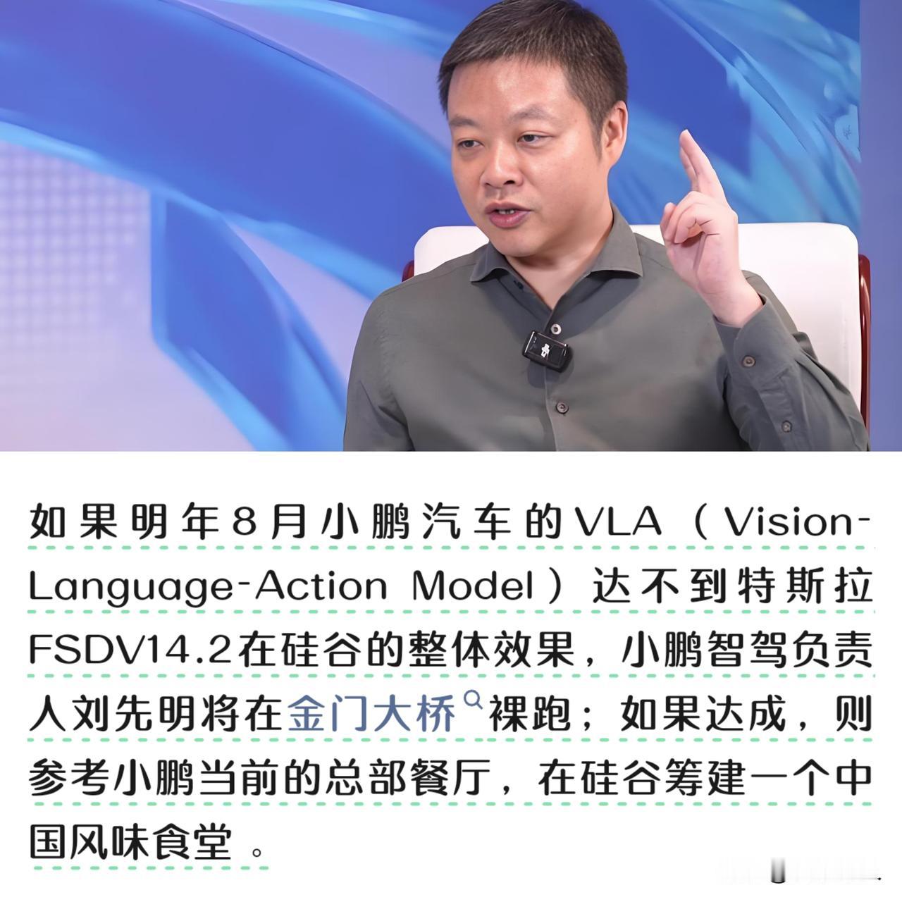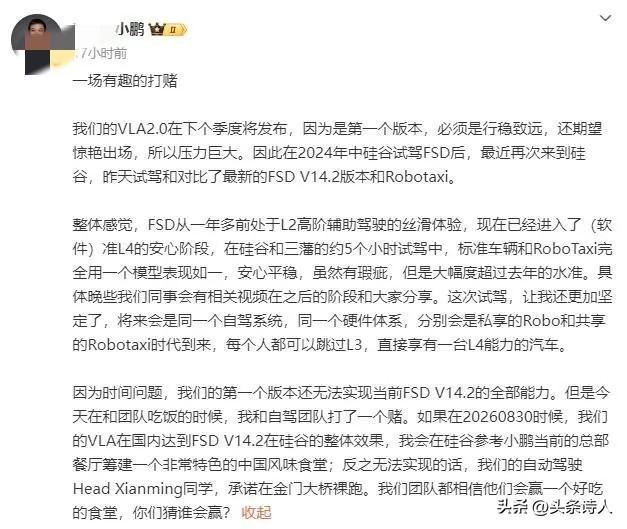 何小鹏,放豪言下“裸奔”注码豪赌: 🔸明年追不上特斯拉FSD,智驾负责人裸奔🔸 🔸输了裸奔,赢了硅谷筹建中式风味食堂🔸 FSD是什么? 全称Full-Self Driving,译文:完全自动驾驶 👉特斯拉FSD有多牛? →打开FSD,打开导航定位目的地,车就会根据线路自行地跟车、变道、超车、转弯,并根据交通信号灯启停; →会监测驾驶员注意力,提供声音提醒,提示注意路面情况; →驾驶员注意力不集中会被提示警告,连续警告5次无效,会禁止使用FSD功能一段时间。 👉而小鹏目前的智驾系统是VLA 融合了视觉、语言和动作的多模态大模型范式,被视为下一代智驾方案大模型。 目前最高也就是L2级辅助驾驶,驾驶员仍是安全唯一责任人。 值得注意的是,特斯拉FSDV14.2相当于目前小鹏VLA的L4水平,这就是说要直接跳过L3,与FSD进行PK。 你觉得小鹏会赢吗? (取材:大象新闻)