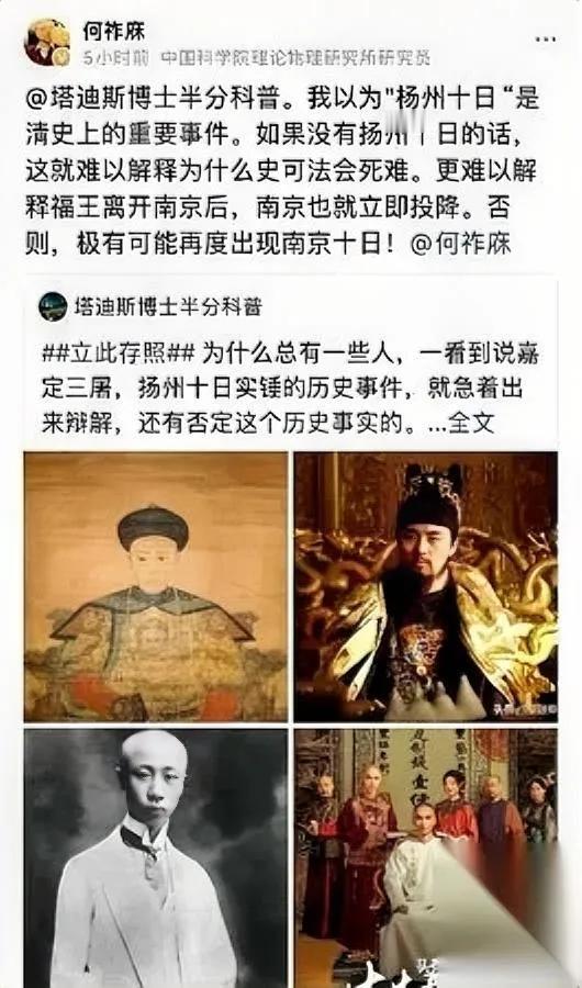 何祚庥又出争议言论? 竟为扬州十日这样辩解 刷到何祚庥谈“扬州十日”的言论,真让人血压飙升!他说扬州十日“很必要”,是为了避免“南京十日”,这逻辑简直让人寒毛直竖。扬州十日屠杀的是谁?是手无寸铁的中国百姓!把血腥屠杀当作“震慑手段”,这种理中客式的冷漠,比屠杀本身更让人脊背发凉。 最荒谬的是,他居然用现代视角去合理化古代暴行,却故意忽略屠杀本质是对生命的践踏。按这个逻辑,是不是所有侵略暴行都能被包装成“历史必要”?那南京大屠杀又该如何定性?任何时候,针对平民的屠杀都是反人类罪行,必须被永远钉在耻辱柱上,容不得半点洗白。 何某所谓的“历史理性”,本质是一种危险的历史虚无主义——用结果论消解过程的罪恶,用群体叙事掩盖个体的苦难。当我们对屠杀的残酷脱敏,当我们习惯用“利弊”代替“对错”,历史的悲剧就可能重演。勿忘扬州十日,不是记住仇恨,而是记住:任何漠视生命的“理性”,都是对人性的背叛。 你怎么看待这种“历史必要论”?欢迎留言讨论。