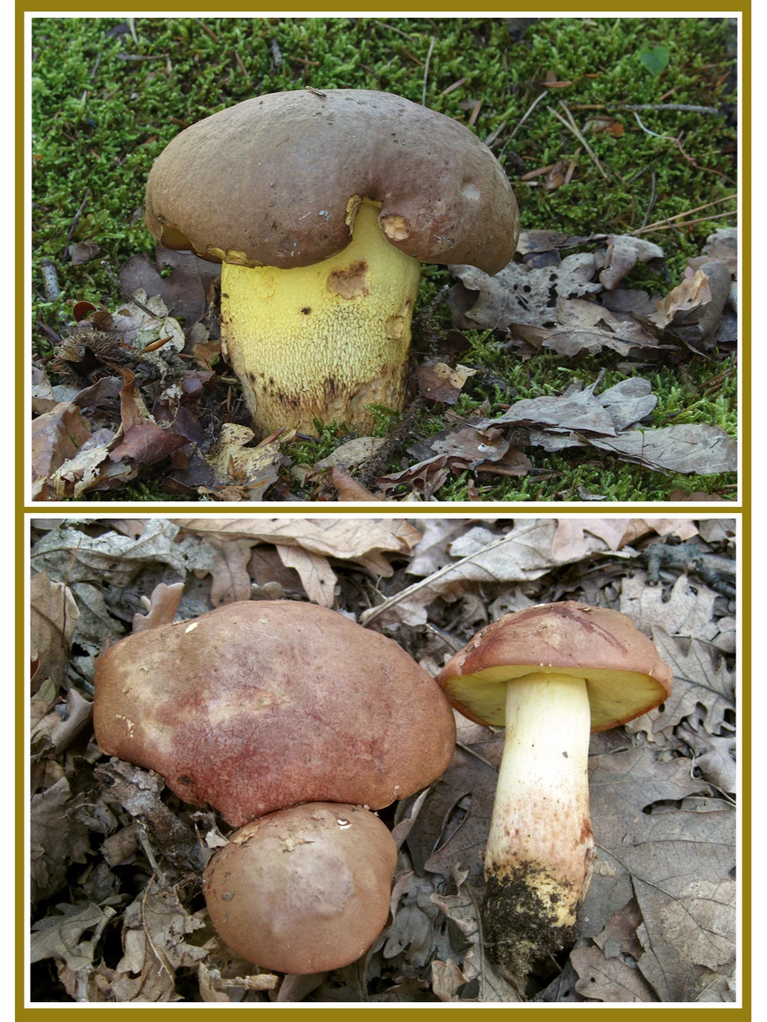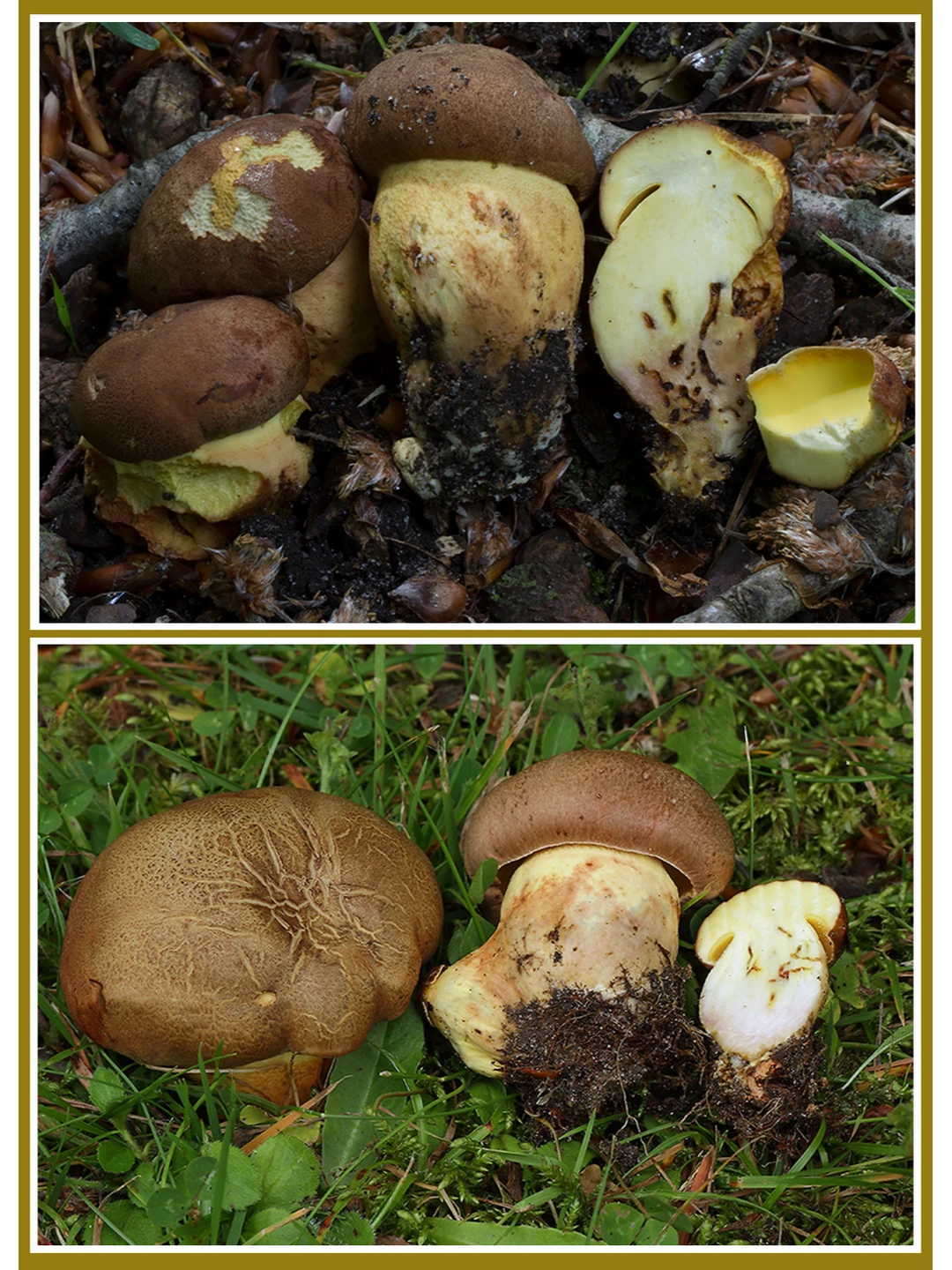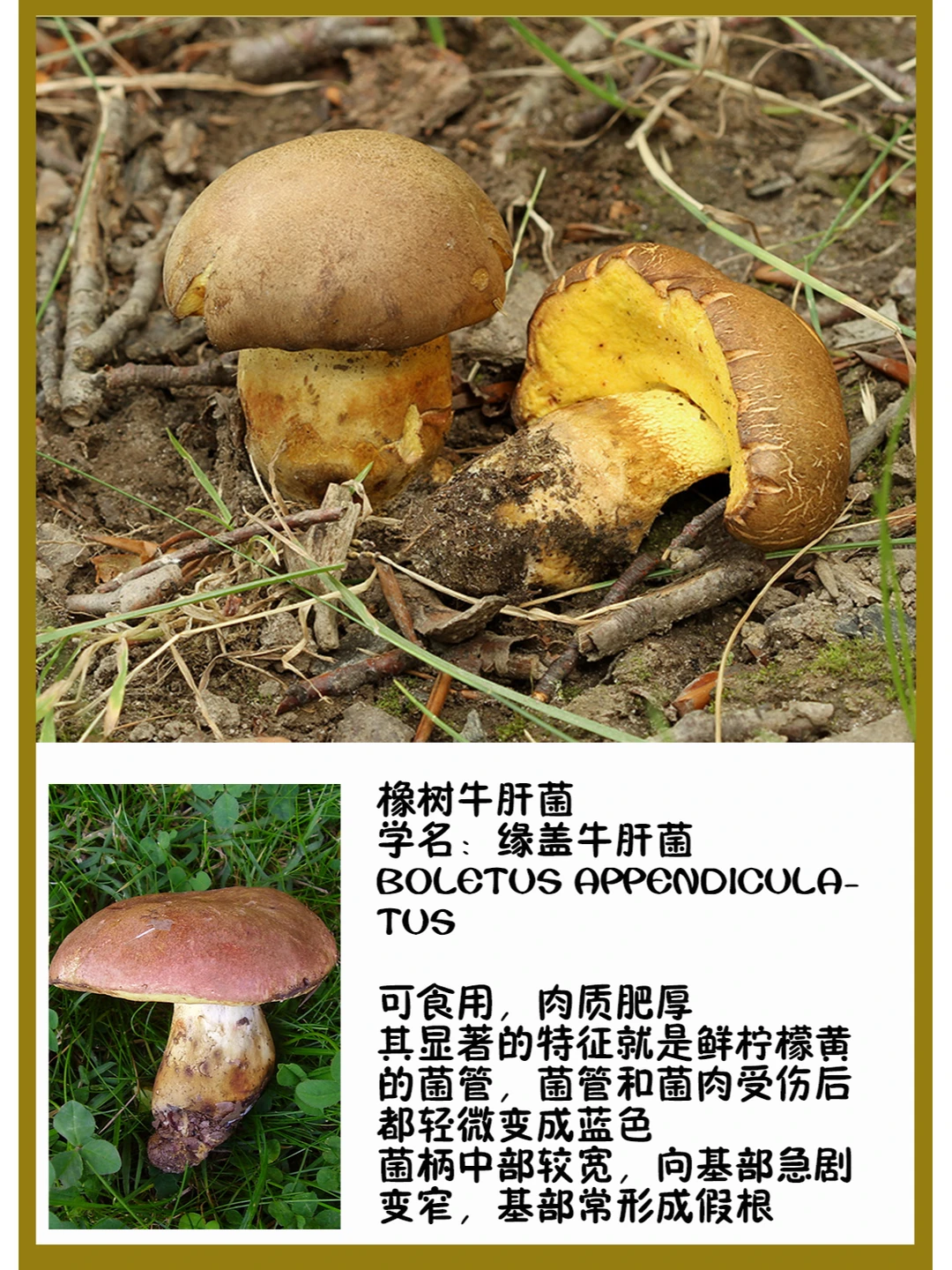 橡树牛肝菌 学名:缘盖牛肝菌 Boletus appendiculatus 可食用,肉质肥厚 其显著的特征就是鲜柠檬黄的菌管,菌管和菌肉受伤后都轻微变成蓝色 菌柄中部较宽,向基部急剧变窄,基部常形成假根