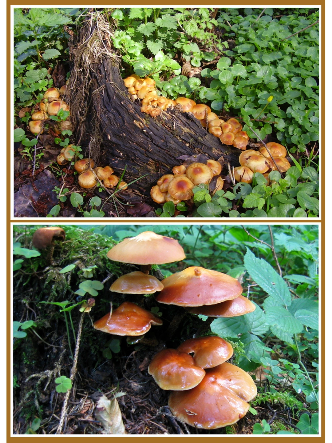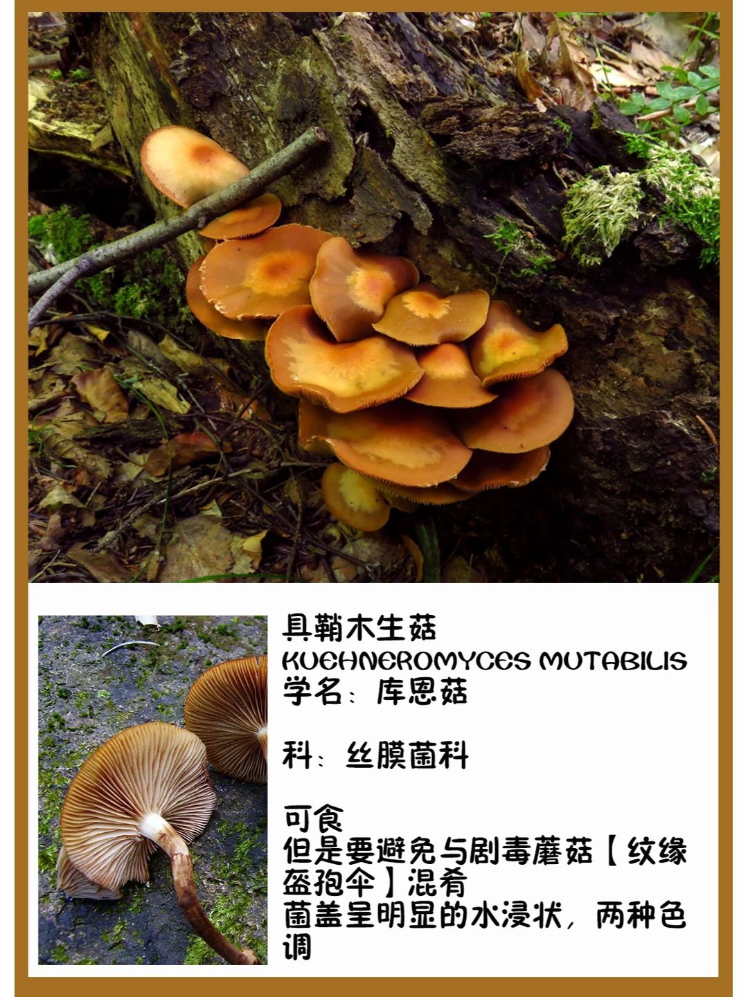 具鞘木生菇 Kuehneromyces mutabilis 学名:库恩菇 科:丝膜菌科 图片©manatarka.org ©josef hlasek 可食,但是要避免与剧毒蘑菇【纹缘盔孢伞】混肴[汗颜R] 菌盖呈明显的水浸状,两种色调[萌萌哒R] 并且菌环以下的菌柄上覆盖着尖角鳞片,菌环会被孢子染成褐色