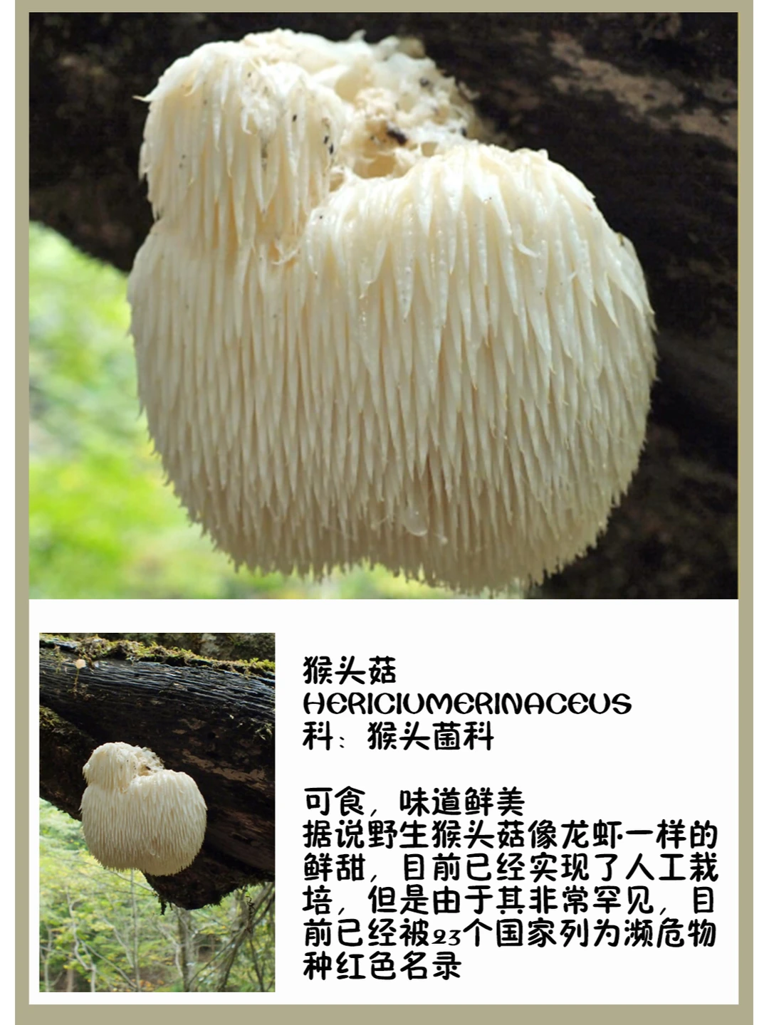 🔍 拉丁名:Hericium erinaceus 🌍 中文学名:猴头菇 🌱 生态环境: 猴头菇广泛分布于北半球的温带地区,常见于森林中的老树或死木上。它独特的生长环境要求使得它成为了人们在自然界中寻找的宝贵食材。你可能会在森林中偶遇这些猴头菇,它们像一颗颗洁白的雪花悬挂在树干上,令人赞叹不已。 🍽️ 是否可食用: 据说野生猴头菇像龙虾一样的鲜甜,目前已经实现了人工栽培,但是由于其非常罕见,目前已经被23个国家列为濒危物种红色名录,所以我们即使见到也最好不要采摘喔~