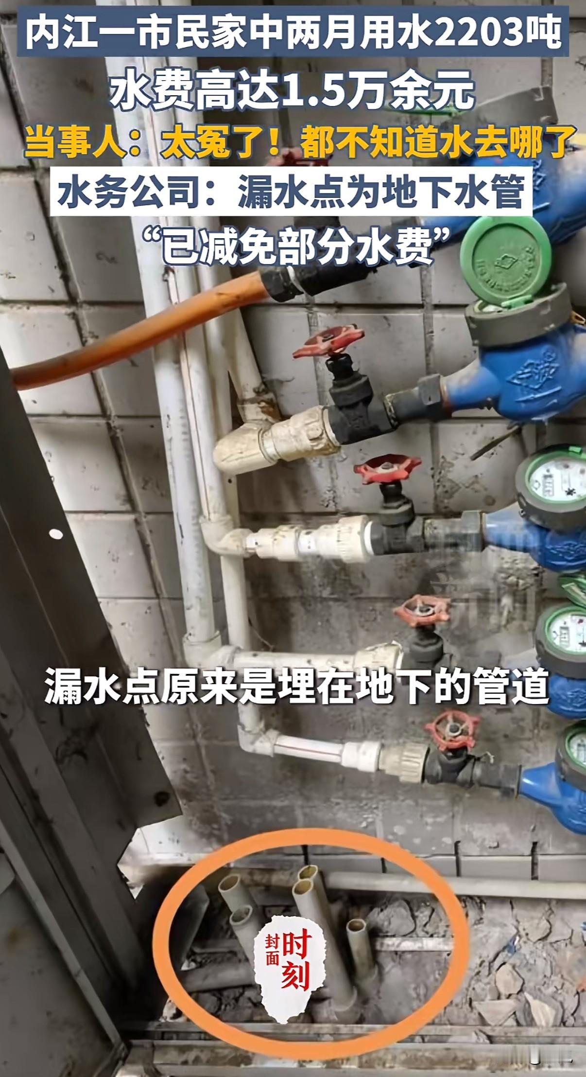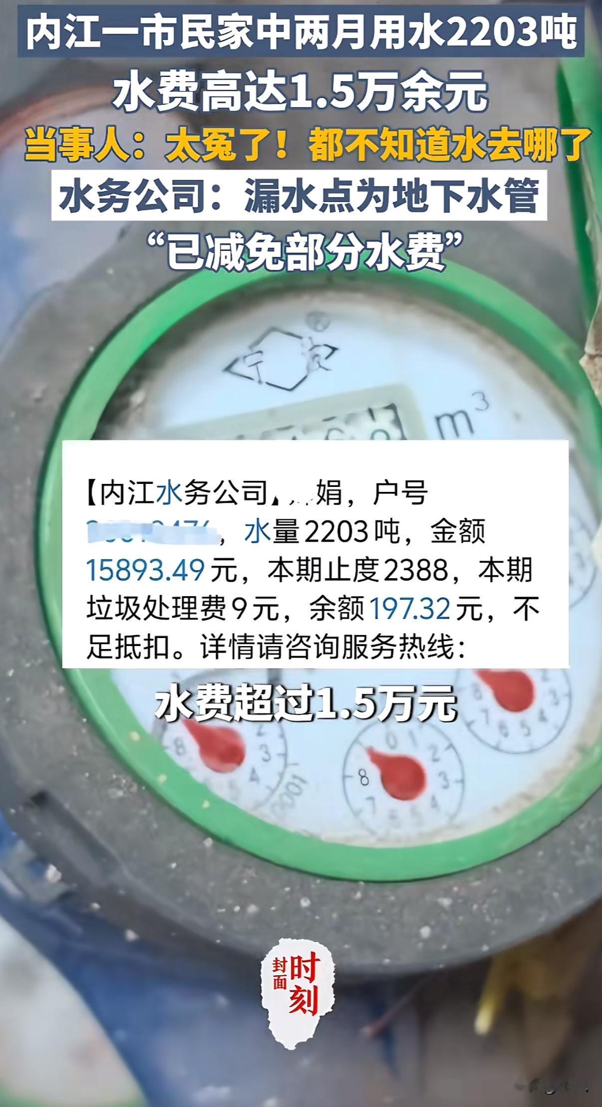 两个月用水2203吨,水费一万五千块。水务公司说按规定用户得担责,用户反问:埋在地下二十年的管子,我怎么管? 四川内江的李娟,最近就为这事焦头烂额。 她家平时两个月用水就十吨左右,这回抄表,数字直接跳到两千多吨。水务公司的人检查后认定,是水表之后、入户之前那段埋在地下的管道暗漏,水全悄无声息渗走了。 账单打出来,一万五千多。李娟无法接受。 水务公司拿出了《四川省城市供水条例》,上面写明,水表后的管道产权属于用户,维护责任和漏损风险也归用户。公司表示,考虑到实际情况,已经给予了政策范围内的最大减免,把费用降到了五千六百元。 但李娟有自己的道理。那段管道从2004年小区建成时就埋下去了,深埋地下,个人根本没有检测手段。她说自己对这段管子的状况是完全失控的,日常不可能去挖开检查。 她还提到,水务公司作为专业机构,对老旧管网是否有提醒或更新的义务?而且抄表周期是两个月,如果能更早发现异常用水,损失也不会这么大。 李娟的父亲身患重病,需要长期治疗,这笔意外开支对她家来说压力不小。她希望对方能再减免一些。 水务公司相关负责人后来回应,规定很明确,但他们理解用户的难处,可以“再向上级反映”。至于结果如何,目前没有承诺。 这件事引起了很多人的讨论。有人说,产权归属清晰,按章办事没毛病。也有人说,对于这种年代久远、完全隐蔽的工程,把全部监控责任推给毫无专业能力的用户,是否合理?智能水表能否增加异常流量预警?老旧小区的管道维护责任又该如何理清? 矛盾就摆在这里:一边是白纸黑字的条例,一边是用户感到的无力和高昂的代价。