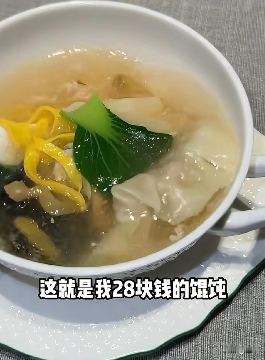 28元一碗的馄饨只有两颗?高消费,还得看沪上有钱人。 刷到个离谱的视频,一碗馄饨标价28块,结果碗里就两颗! 镜头里的馄饨碗倒是精致,配着青菜、蛋皮,汤头看着也讲究,但数来数去就俩馄饨躺在里面,这性价比直接给我看懵了。 咱不是说不能有高端餐饮,可馄饨这玩意儿,说到底还是带着市井烟火气的小吃,突然被抬到这个价位,还是两颗的量,难怪网友都调侃“还得是沪爷有钱”。 不知道是餐厅玩的噱头,还是真的走“精致到极致”的路线,反正普通打工人表示,这馄饨我是吃不起,还是蹲街边10块钱一大碗的鲜肉馄饨香啊。 你觉得这28元两颗的馄饨值吗?评论区聊聊~ 晒图笔记大赛上海 餐饮