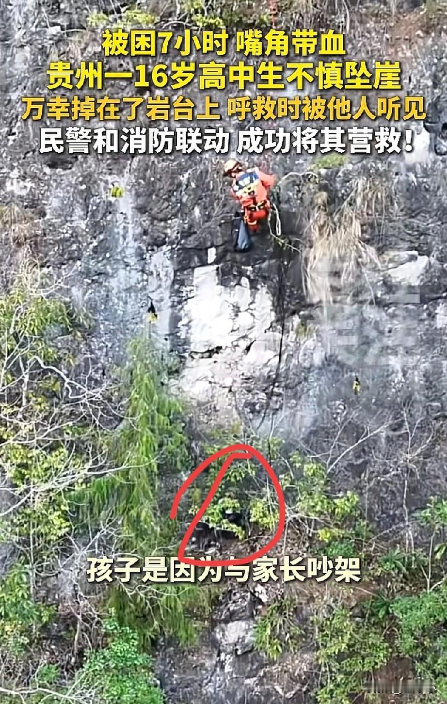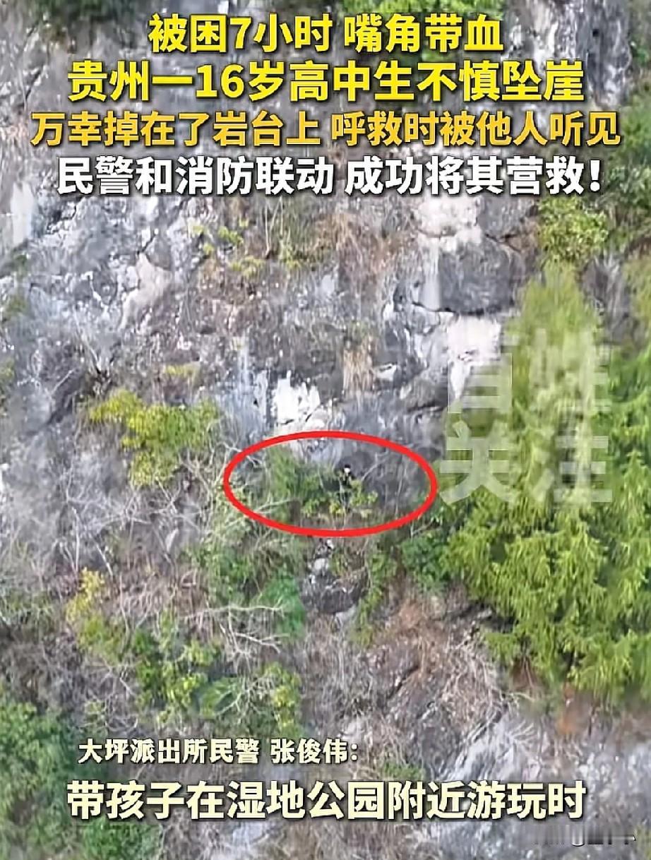 福大命大啊!贵州遵义,16岁的高中生不慎坠崖,万幸掉入在岩台上,被困7个小时,嘴角出血,呼救时被他人听见,消防和民警联合行动,好在结果是好的。 林女士带着孩子在湿地公园里面玩耍,就听到有人在悬崖边呼救,但林女士光是听到声音,并没有看到人,林女士也不敢耽误立马就报警。 接警后,相关部门快速的来到现场,因为无法定位被困人员,只能先用无人机来搜索,果不其然通过无人机发现了一名10多岁的孩童在下面。 双方联合顺利的把孩子给救了上来,经过询问得知,孩子是和家长吵架了,自己独自一人来到这边散心,不小心就掉了下来。 掉下来之后,就在那里呼救正好被林女士给听到了,这才得救。 不得不说,这孩子真的命大! 也幸好被人给听见了,要不然这么冷的天气,又饿又冷不出事才怪!