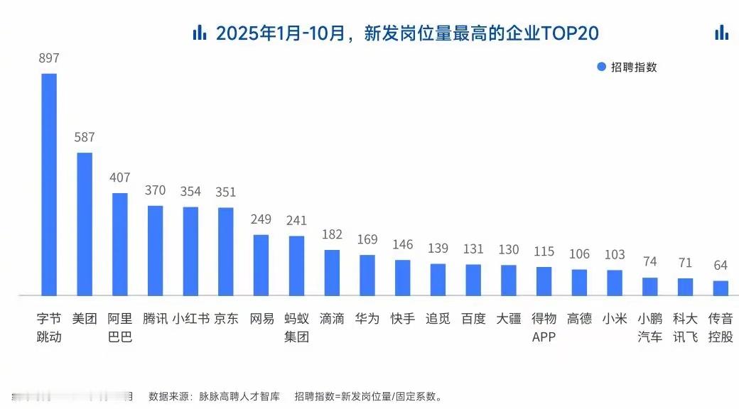 2025年1—10月,高薪岗位TOP20的平均月薪均超过6万元,AI研发岗占据大半。企业招聘格局上,字节新发岗位量断层领先,美团、阿里紧随,小红书跻身热招TOP5,智能硬件、互联网企业岗位增幅显著。 AI岗位需求上,字节AI岗位量居首,小红书、蚂蚁紧随,智能硬件、新能源汽车/出行行业对AI人才需求强烈。(图片来自“脉脉高聘人才智库”)