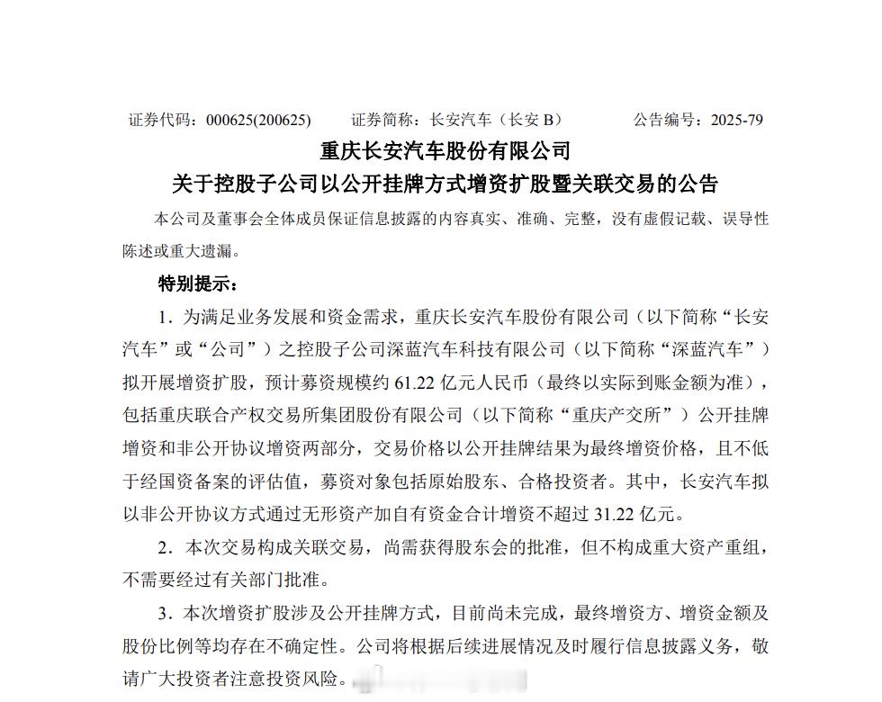 长安深蓝汽车 长安汽车发布公告,其控股子公司深蓝汽车科技有限公司计划进行增资扩股,预计募资规模约为61.22亿元人民币此次增资包括重庆产交所公开挂牌增资和非公开协议增资两部分,增资价格将根据公开挂牌结果确定,且不低于国资备案的评估值募资对象将包括原始股东和合格投资者。长安汽车计划以非公开协议方式参与增资,增资规模不超过31.22亿元,其中无形资产评估价值为10.43亿元,其余以现金方式增资,资金来源于自有资金。增资后,长安汽车将保持对深蓝汽车的控股比例不变,仍为50.9959%。新能源汽车