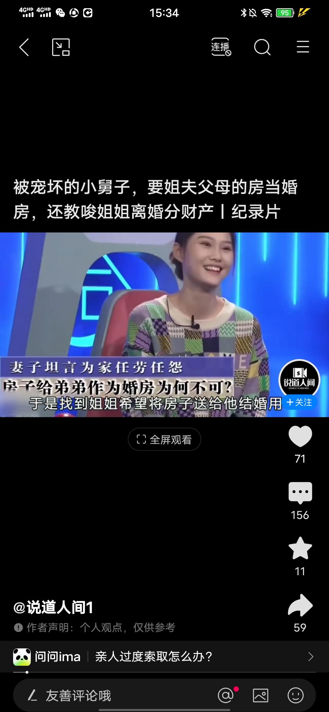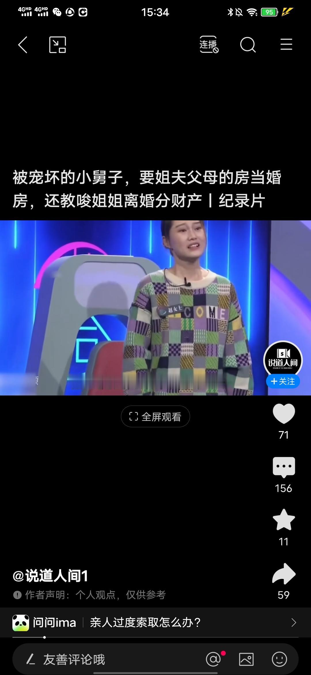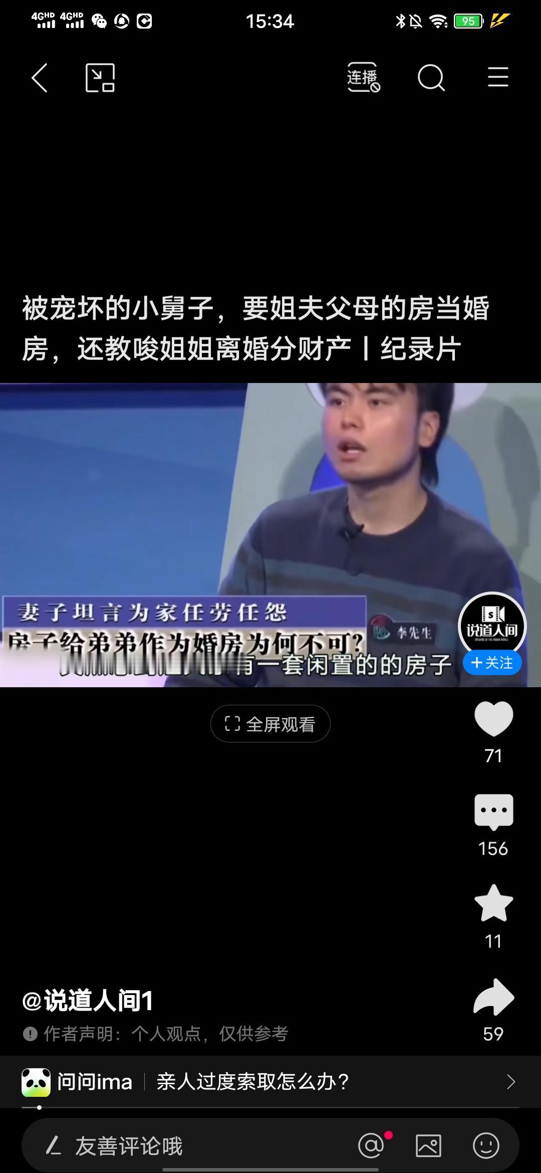 被宠坏的小舅子,要姐夫父母的房当婚房,还教唆姐姐离婚分财产! 刚看到一个纪录片,哎哟,把我给气坏了!故事讲的是一对奇葩姐弟,姓赵的一个女的,有个弟弟,通过视频看到他们的所作所为所言,可以断定这家人把这个弟弟给溺爱得毁了,上大学开始就是姐姐和姐夫在扶持,现在25岁了,要结婚了,但是没有婚房,就盯上了姐夫父母的房子,赵女士经过家人的教唆,回家给丈夫李先生一说,李先生坚决反对,放在任何人身上都会反对的,凭什么啊是吧? 可是这个伏弟魔姐姐,居然说,父母的房子反正最后也是他们的,现在给他们又有什么关系,非得就要人家这套房子,丈夫不同意,她就说反正她就想让弟弟在那套房结果,如果不同意,她就跟丈夫离婚,然后夫妻财产一人一半,她再用她分得的钱给弟弟买房,反正就是宁愿离婚不要孩子也要要弟弟,要给弟弟买房结婚。还被自己娘家人洗脑了,说李先生不同意,就是不爱她,什么混账逻辑,人娶你一个,还要养你全家? 后来,那个混账弟弟也上场了,反正就主打一个要房子,为了得到财产,得到房子,鼓动姐姐离婚分财产,为了达到丑恶目的,还撒谎诬陷姐夫出·轨,被嘉宾拆穿谎言后,还理直气壮地承认说,我为了姐能分到房子,撒个谎怎么了?这是个正常人说的话? 毕业后,姐夫给找了个不错的工作,却因为老板吃饭没有叫他而生上气了,还跟人吵起来了,说的深更半夜,老板吃完饭凭什么让他去接人,吃饭的时候怎么不叫他?简直搞不清自己的身份!妥妥一个寄生虫,无底洞! 真的没见过这么无赖的姐弟俩了,无赖得让人气愤,简直厚颜无耻,贪得无厌,跟这样没有边界,没有是非的一家人在一起,真的就是灾难,一个成家的人,一个当妈的人了,想没想过自己的孩子呢?你要养你弟一辈子,最开始你就不要结婚,不要把这荒唐行为强加于别人,这不道德。 当然,兄弟姐妹之间是应该相互帮助相互扶持,但那是建立在相互的基础上的,而不是一方只付出,另一方只一味索取,每个人都有自己应该承担的义务和责任,不该承担的,任何人都没有权利和资格强求。各人还是摆正自己的位置,想想自己何德何能,既然投生为人了,就不要去做那害人的寄生虫了吧! 所以,评论区很多网友都支持李先生离婚,为了孩子的将来都应该远离这一家子吸xue·gui,否则,不但自己过得累,还会拖累两个孩子,友友们,你们觉得呢?