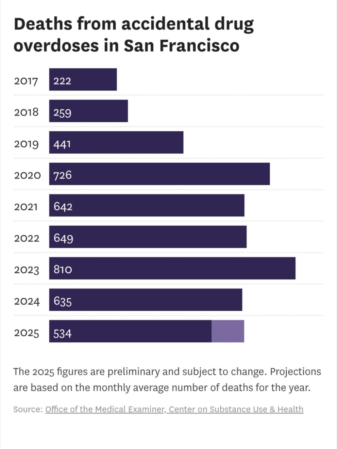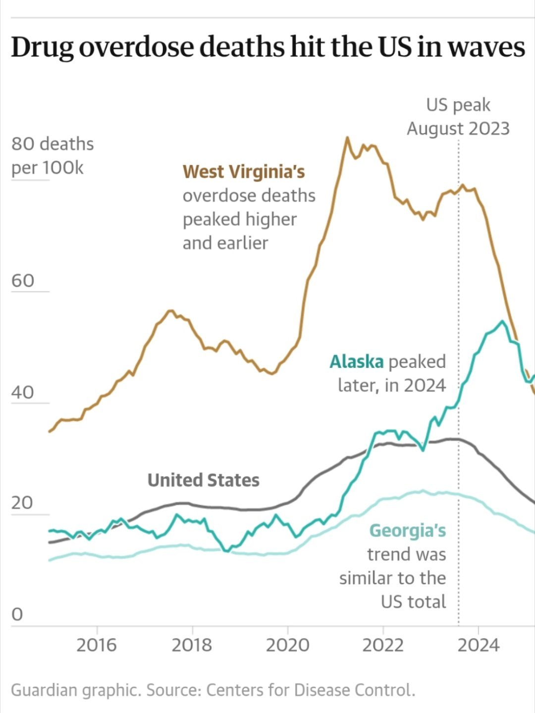美国毒品问题有多严重实际上美国的毒品问题在全球来讲,已经没有那么严重。正在持续稳中向好。¹ 毒品问题严重的国家,是墨西哥以及哥伦比亚那种。毒品经济已经深入到社会的各个角落。正当行业也笼罩在毒情影响下。因为鳄梨种植业、渔业以及运输业都是贩毒集团的势力。美国远远不是这种。² 美国的毒品泛滥已经一百多年了。我们的人老是很多以为芬太尼出现以后,美国毒品才“泛滥”。费城肯辛顿大街才“遍地僵尸”。实际上不是。美国从19世纪末20世纪初毒品就泛滥,但毒品问题并不算严重。美国依然是世界第一强国。毒品泛滥基本不影响美国强大。³ 美国过去十年最大的问题是吸毒死人太多。这跟吸毒者太多是两码事。过去海洛因、可卡因以及处方药不会造成大量死亡。大麻就更加不会了。但芬太尼会。卡芬太尼会。尼秦类毒品也会。更重要的是,一旦芬太尼到处出现氢吗啡酮、羟考酮假药片里,不管你是罗伯特·德尼罗的外孙子,还是刚考上律师的富家女,还是住纽约豪华公寓的基金经理,都会中毒死掉。中产阶级家庭也死人太多,问题才成为“问题”。⁴ 所以,现在随着芬太尼死亡快速下降的同时,可卡因的查获量有所增加。亚利桑那州去抓非法移民的警力增加,但抓普通毒贩的行动有所减少。图1:全美以及各个州的药物过量死亡总数和比例都在大幅下降。² 图2:另一个毒品泛滥的主要城市旧金山市,吸毒死掉的人数也在大幅下降。已经快降到2018年水平。⁵ 我们解读美国毒情,一定不要犯低级错误,就是用中国人的眼光去代入美国人。这样不容易理解美国人,也容易吓到自己。美国的毒情要是回到2015-2016年以前,他们国内预计是比较舒服的状态,就是大家都没有什么压力,毒品去罪化继续搞。像欧洲多个国家那样子泛滥也没有关系,因为不会死那么多人,更加不会死那么多中产家庭的子女。⁶ 当下美国的毒情形势还在变化。先等特朗普2.0挂羊头卖狗肉,利用芬太尼议题炒作,打完委内瑞拉、哥伦比亚,清扫西半球后院;然后再结合墨西哥那边哈利斯科新一代卡特尔的整合情况,观察大约一年以后再说。短期看,美国毒情仍然在稳中向好。热点科普