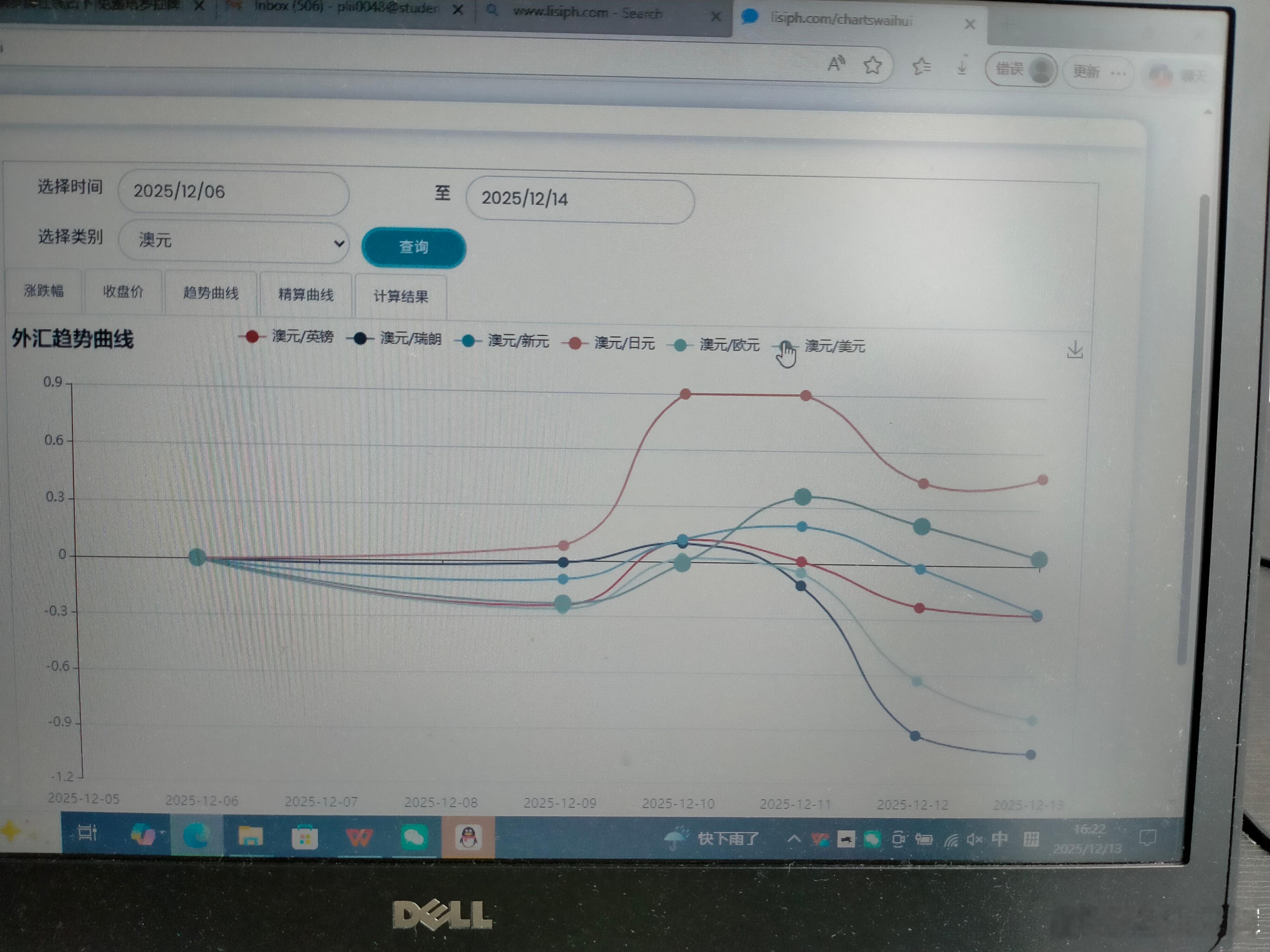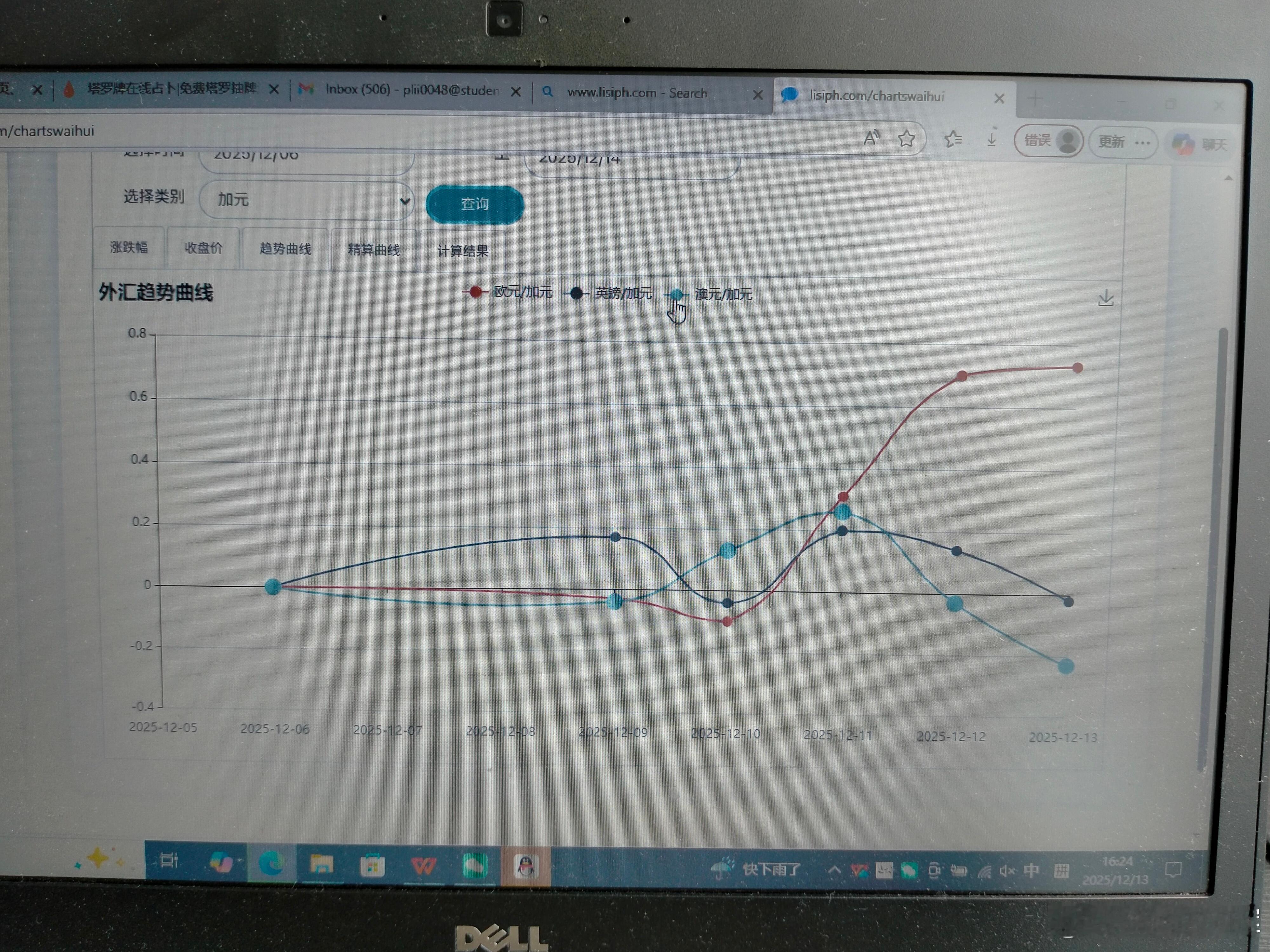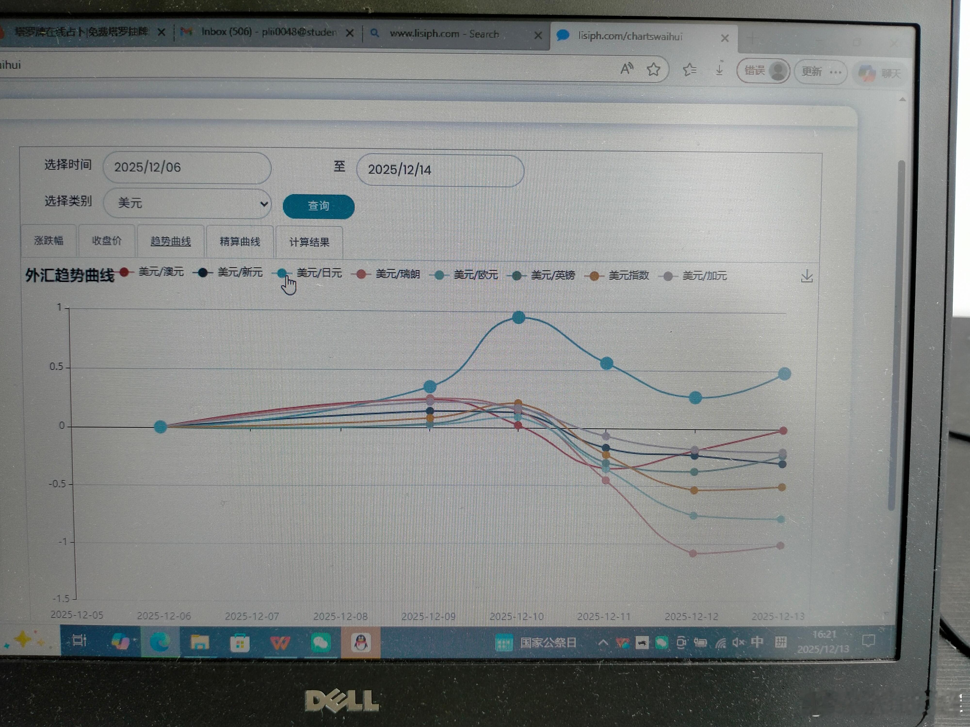 本周主要汇率走势 本周美元降息,估计要看下周市场的反应。本周瑞郎最强,日元最弱。 图一是美元本周的涨跌幅曲线,虽然涨多跌少,但跌幅大于涨幅,所以,本周美元还是弱势,图二是趋势曲线,兑日元上涨外,兑其他几个主要币种都是下跌的。看看下周能不能反弹一下吧? 图三是澳元本周的趋势曲线,澳元本周创出一点小高点,估计会调整一下了吧? 图四是欧元本周的趋势曲线,图五是英镑本周的趋势曲线,图六是瑞郎本周的趋势曲线,瑞郎最强,欧元稍微弱了一点,但比英镑强。估计英镑会延续一下,看看欧元能不能上冲一下吧? 图七是兑日元的趋势曲线,日元持续弱势。 图八是兑加元的趋势曲线,加元居中吧。 图九是正向和反向态势图,现在日元在低位区域,美元兑除日元之外的币种也在低位区域。但还是要看看吧?