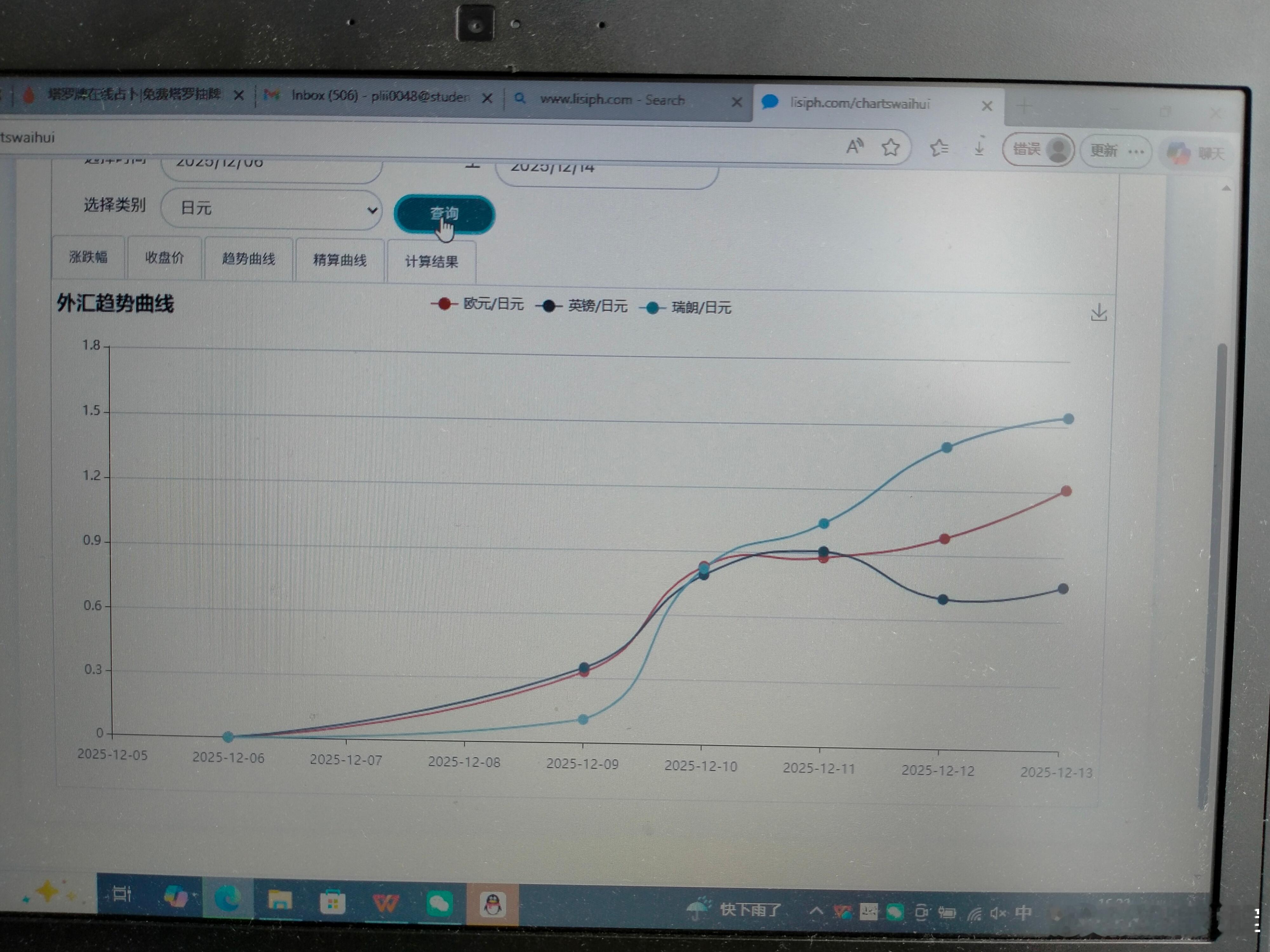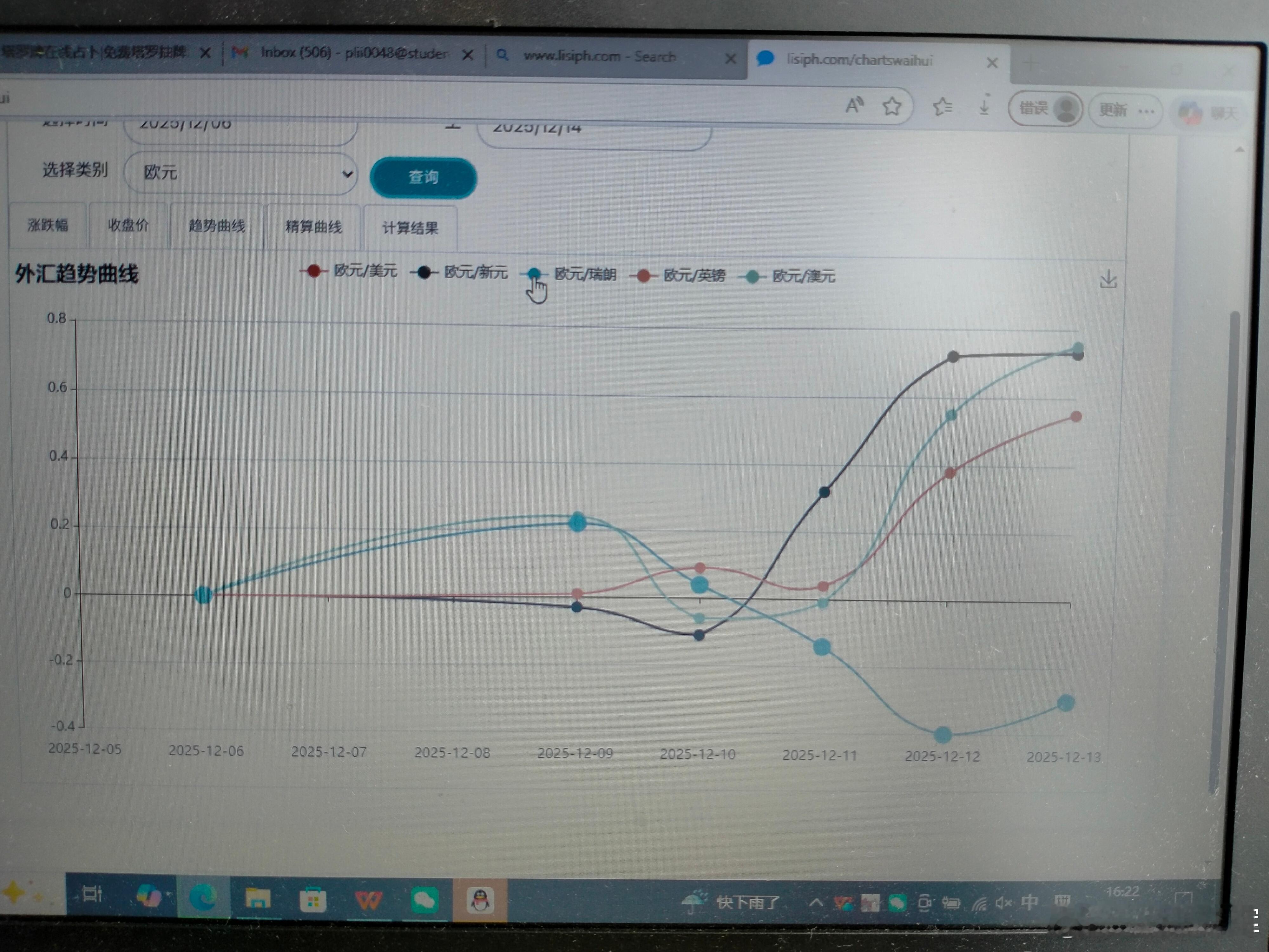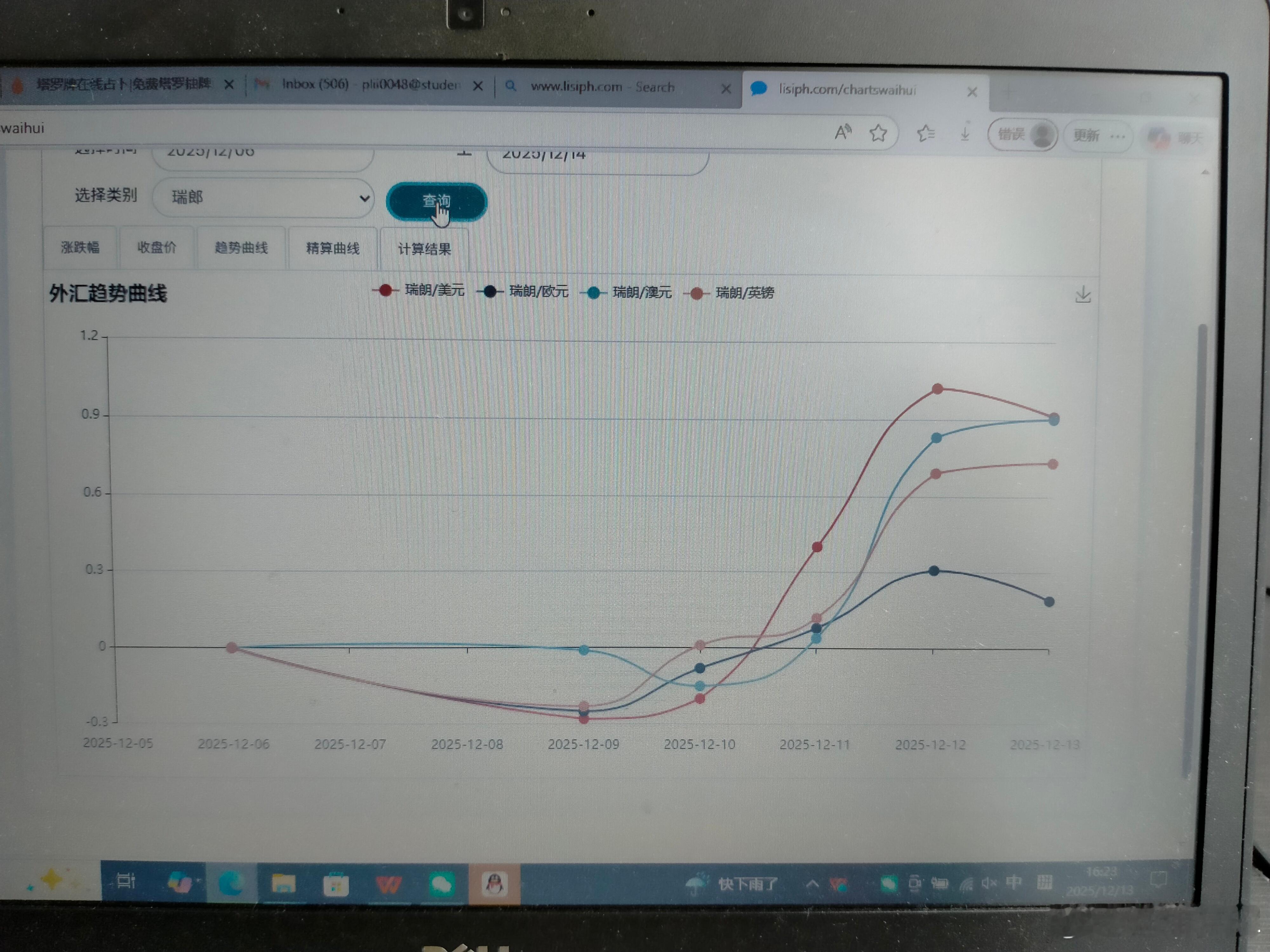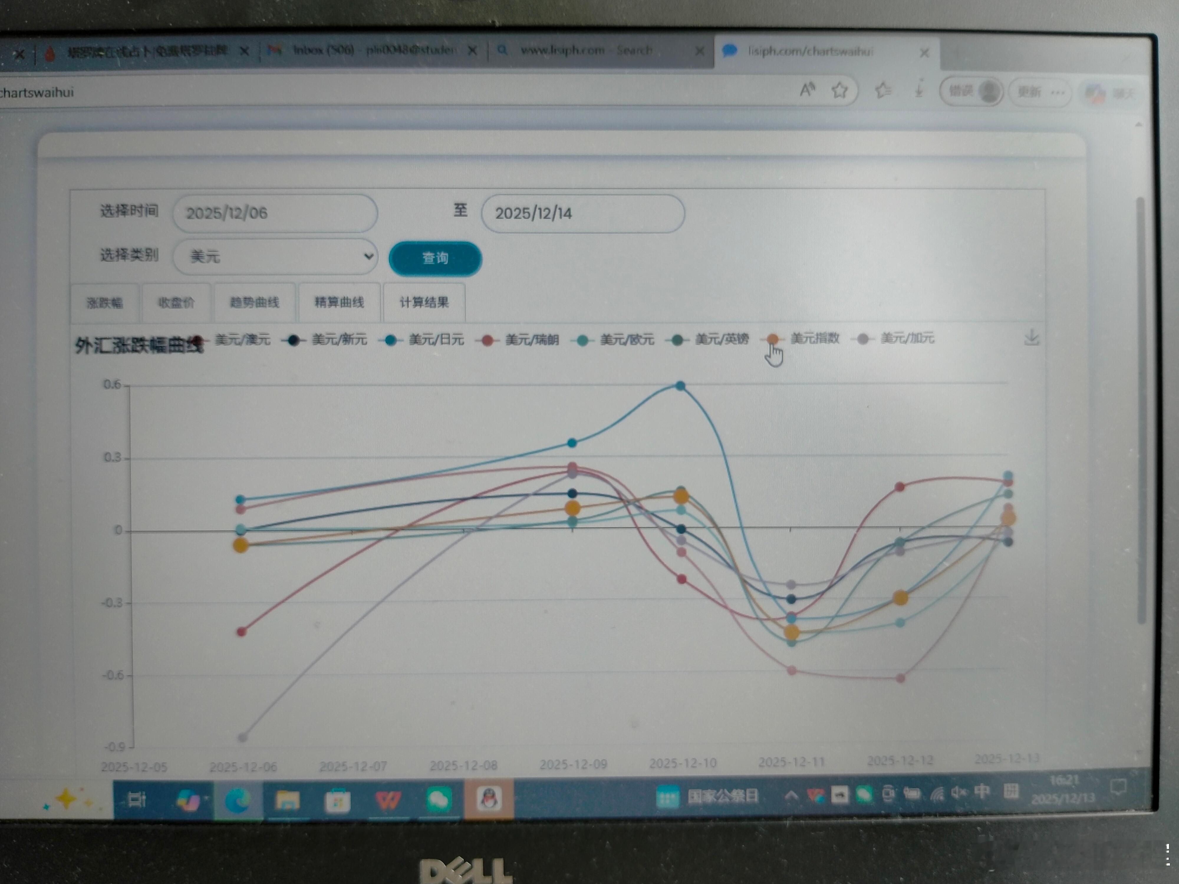 本周主要汇率走势 本周美元降息,估计要看下周市场的反应。本周瑞郎最强,日元最弱。 图一是美元本周的涨跌幅曲线,虽然涨多跌少,但跌幅大于涨幅,所以,本周美元还是弱势,图二是趋势曲线,兑日元上涨外,兑其他几个主要币种都是下跌的。看看下周能不能反弹一下吧? 图三是澳元本周的趋势曲线,澳元本周创出一点小高点,估计会调整一下了吧? 图四是欧元本周的趋势曲线,图五是英镑本周的趋势曲线,图六是瑞郎本周的趋势曲线,瑞郎最强,欧元稍微弱了一点,但比英镑强。估计英镑会延续一下,看看欧元能不能上冲一下吧? 图七是兑日元的趋势曲线,日元持续弱势。 图八是兑加元的趋势曲线,加元居中吧。 图九是正向和反向态势图,现在日元在低位区域,美元兑除日元之外的币种也在低位区域。但还是要看看吧?