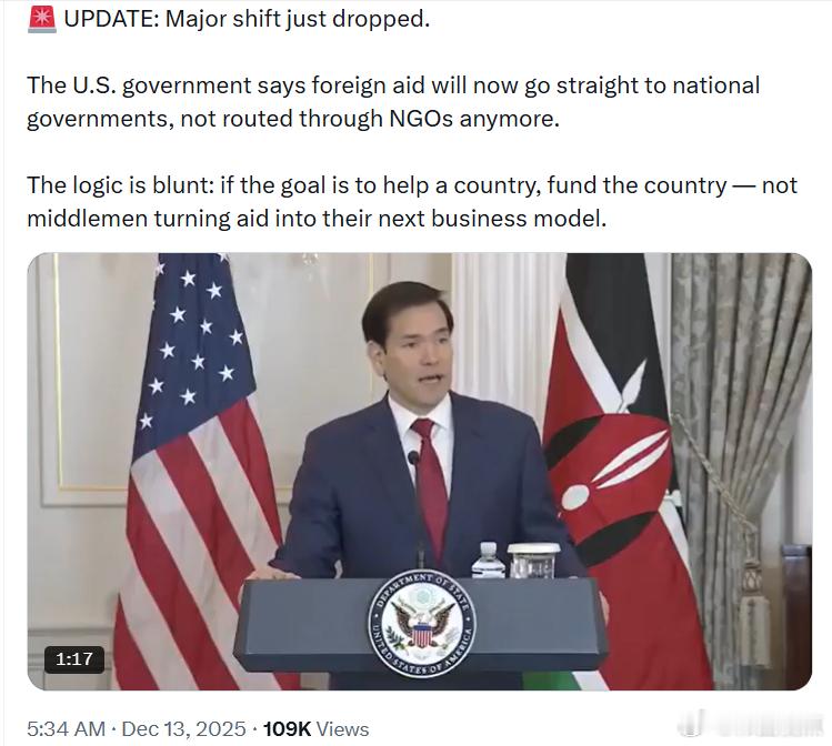 重大转变美国政府表示,对外援助将直接拨给各国政府,不再通过非政府组织(NGO)中转。逻辑非常直接:如果目标是帮助一个国家,就直接资助这个国家——而不是让中间人把援助变成他们的下一个生意模式。