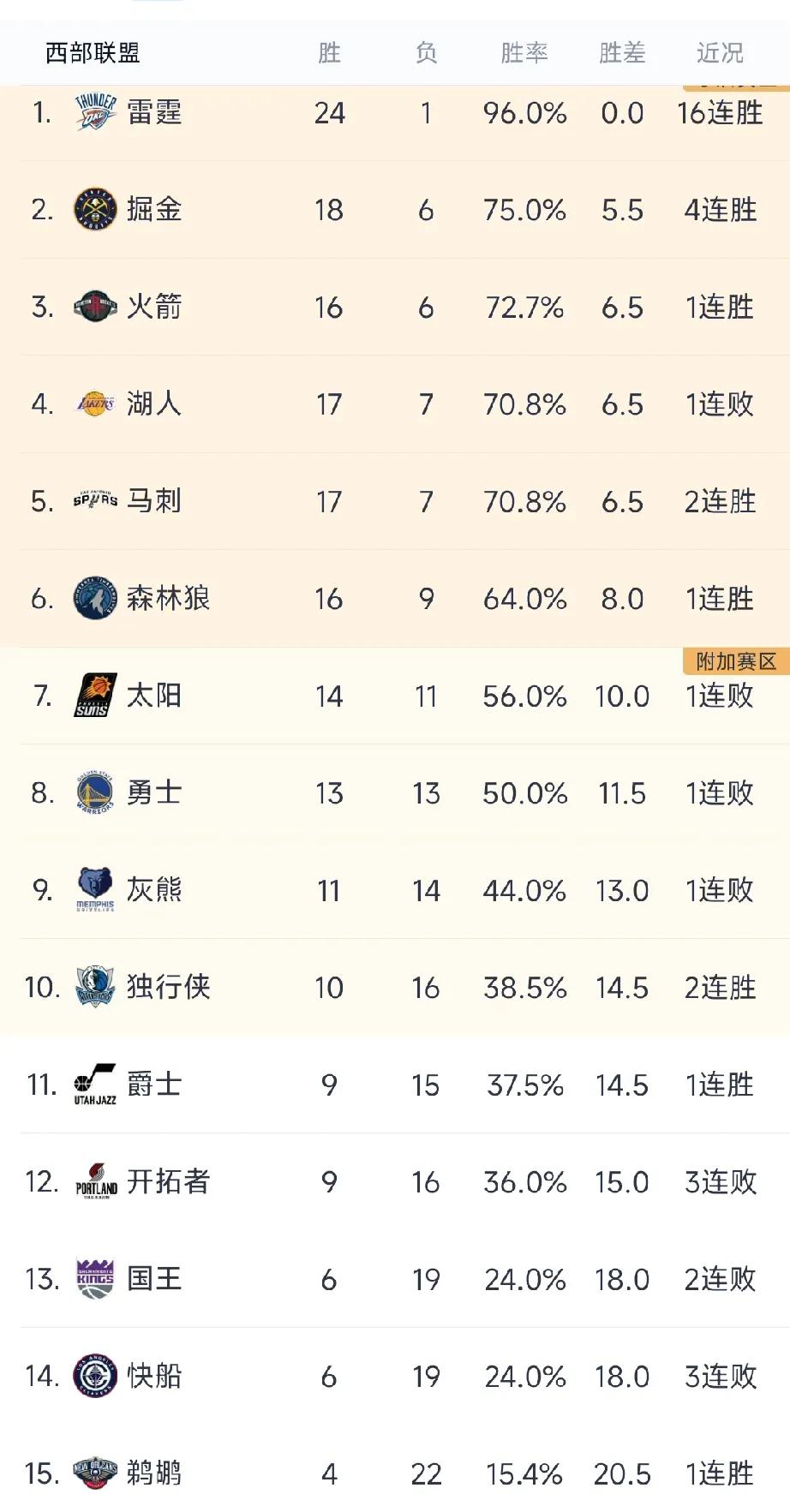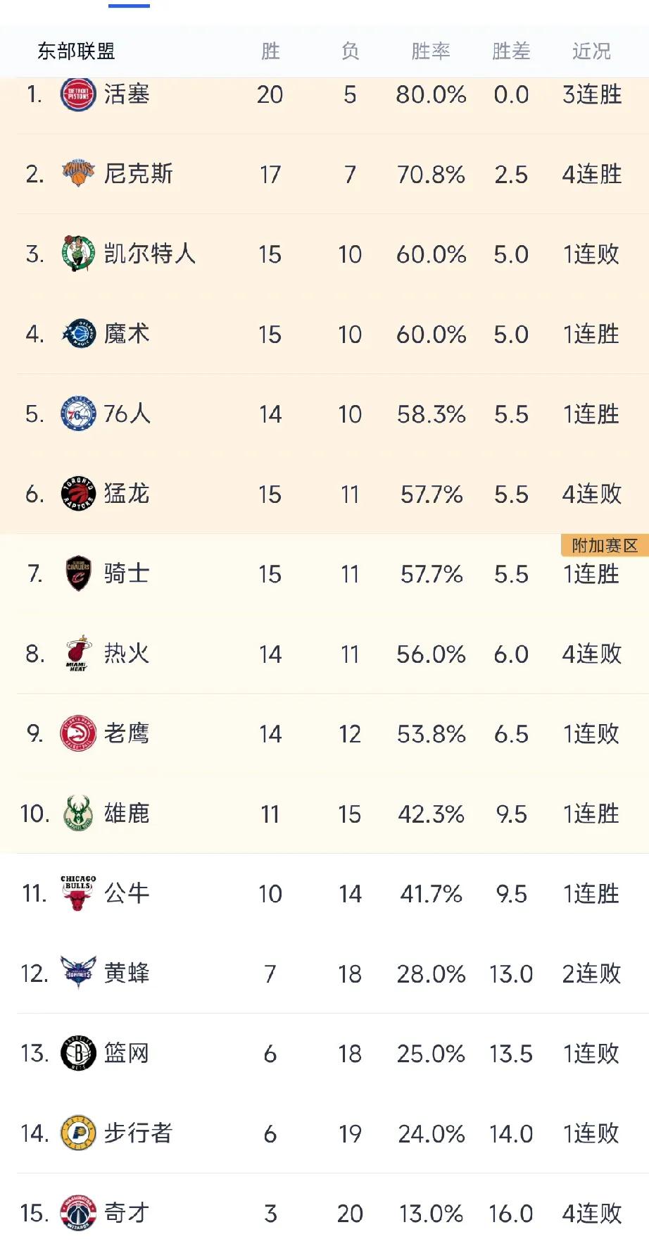 NBA最新排名: 西部篇:独行侠真的开始北伐了,随着浓眉回归状元弗拉格的快速成长,独行侠目前冲进附加赛区域。 东部篇:活塞还在赢,成为东部第一支20胜球队,76人今天凭借大帝恩比德的回暖暂时保住了东部第五的位置。