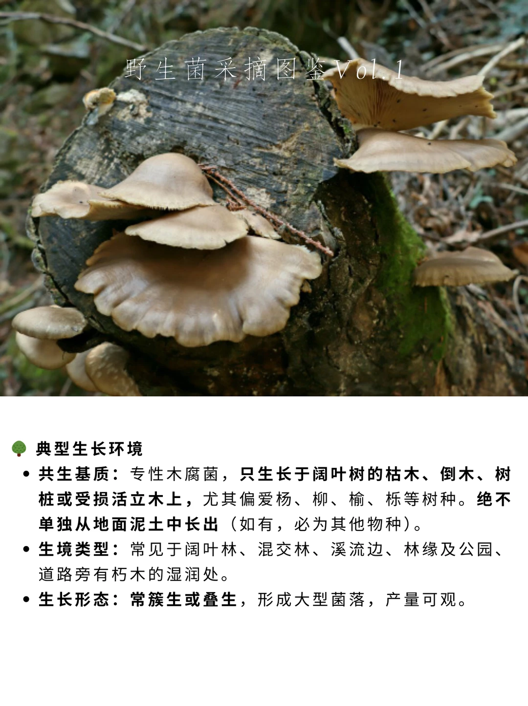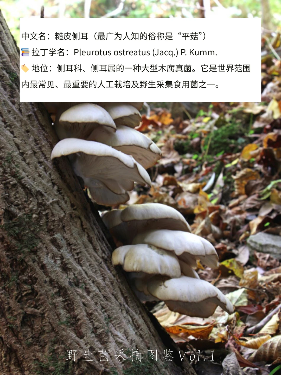 🏷️ 地位:侧耳科、侧耳属的一种大型木腐真菌。它是世界范围内最常见、最重要的人工栽培及野生采集食用菌之一。