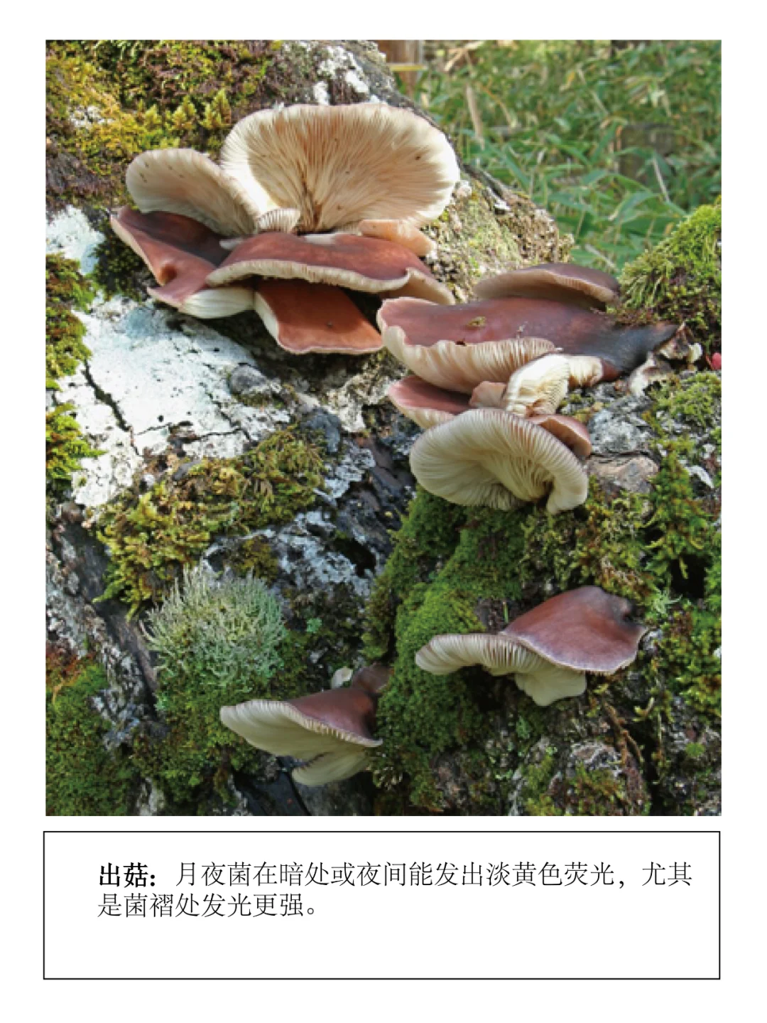 月夜菌在暗处或夜间能发出淡黄色荧光,尤其是菌褶处发光更强。这种发光特性让它们在夜晚的森林中格外引人注目。🌌