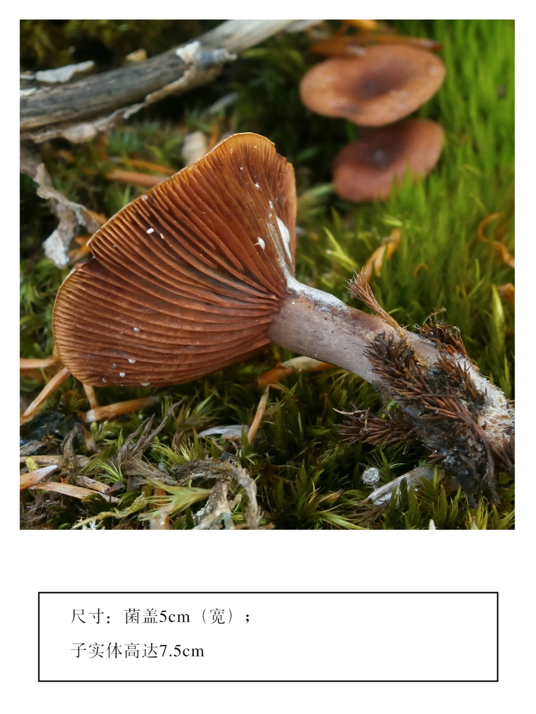 菌柄:长2-5厘米,粗0.4-0.8厘米,近柱形,色与菌盖相似,内部松软,后中空。
