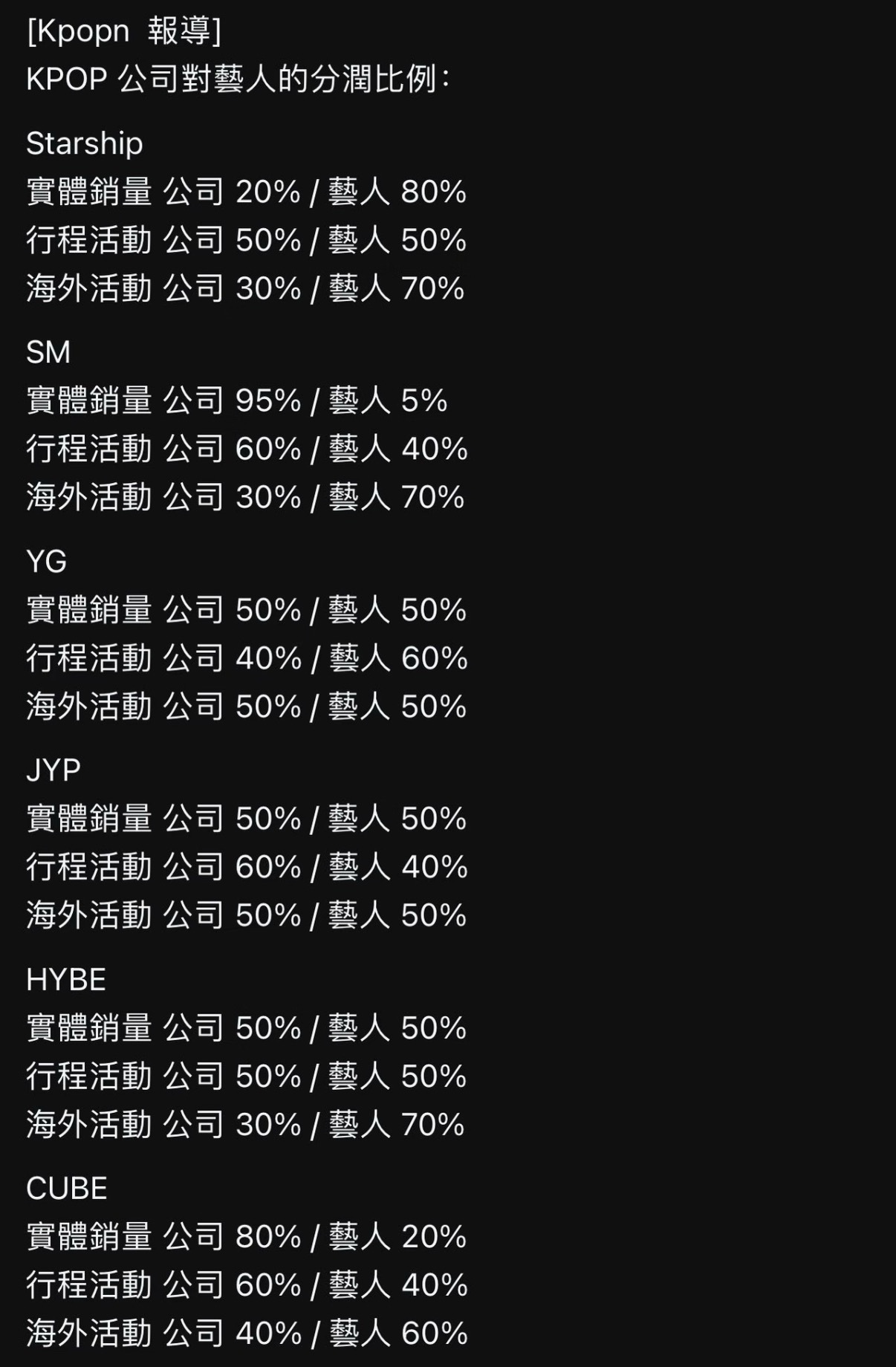 KPOP公司对艺人的分润比例引热议SM公司真的假的…
