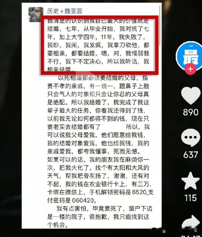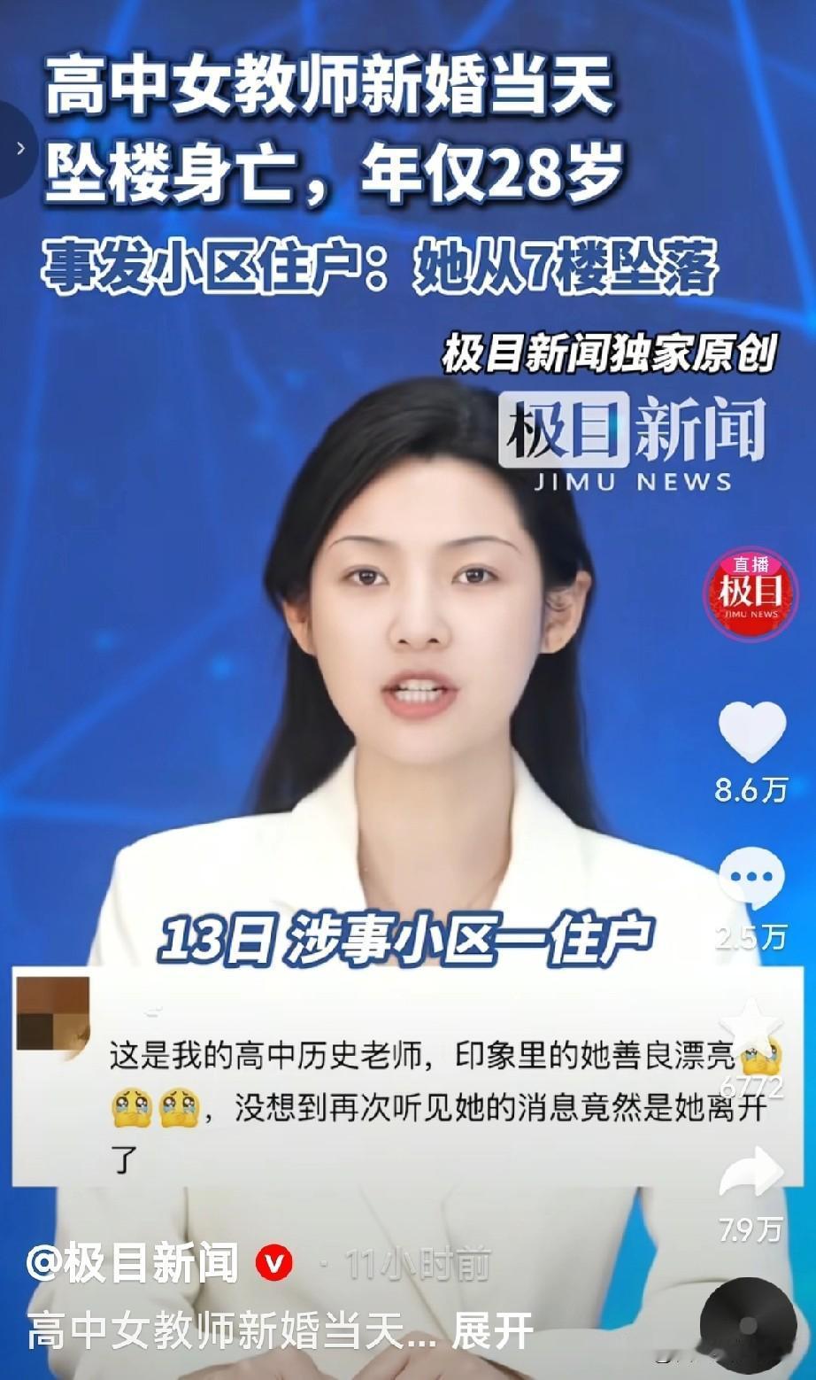 河南鲁山婚礼当天坠楼的女老师,才28岁。是县里最好高中的在编历史老师,她离世后,很多同事和学生提起她,都充满了惋惜。 学生评价她,是个美丽善良的人,会在暴雨天送没带伞的学生回家,自掏腰包给贫困学生买教辅资料。 同事也说,她很受学生欢迎,在他们印象里女老师是个温和、有风骨的教育者。 可是这样有才的一个女子,在父母眼里,却只有结婚才有价值。明明她那么优秀,努力考上了大学,成为一名教书育人的老师,实现了人生的价值。可这些在父母眼里,都没有结婚有价值,只有同意相亲,她才能成为父母眼中的乖女儿,亲戚眼中的懂事女孩。 她也试图努力说服父母,甚至暴力对抗过,可还是失败了。即使她说她和未来的对象一点也不和谐,可是在父母眼中,不管和谁,只有结婚了就行。 最可悲的是,有知情者说,即使女老人没了,她父母都不愿给她收尸,说嫁出去就不管了。结婚对象也说没娶到也不会管。 无语了,她刚出生的时候,难道你们就想着让她以后结婚生子?难道不是让她快快乐乐过一生吗? 对于这件事,你怎么看呢?