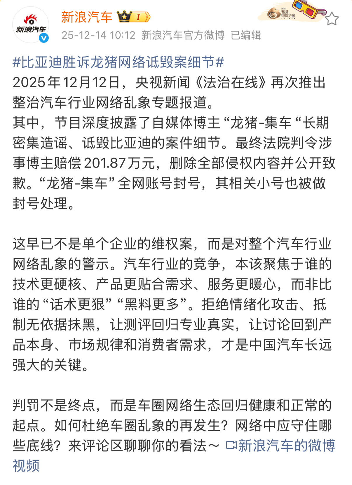 比亚迪胜诉龙猪网络诋毁案细节长期密集造谣居然只是赔偿+封号,我觉得比亚迪还是有点心慈手软了……