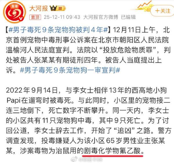 上海女子在小区投毒,毒死了宠物狗,用的氟乙酸,判罚赔偿1.8万北京男子在小区投毒,毒死了宠物狗,用的氟乙酸。判罚有期徒刑4年同样的毒物也分“阳性”和“阴性”?投“阳性”毒坐牢。投“阴性”毒罚款。不觉得打脸来的太快了?为什么同罪不同罚呢上海女子投毒致两犬死亡男子毒死9条宠物狗被判4年