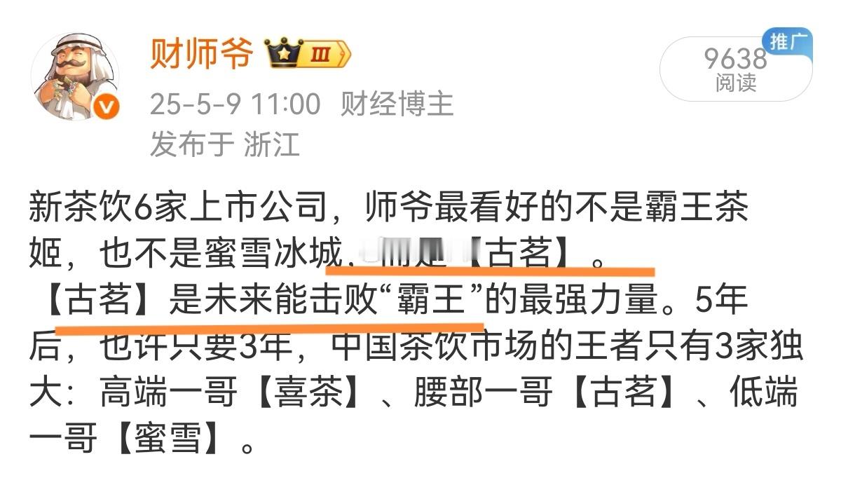 2024年来,中国数百家茶饮公司中,营收、净利润实现两位数双增长的,仅有两家:蜜雪冰城、古茗。师爷最看好的就是【古茗】,上市后如虎添翼,管理团队也很务实,又上进,未来一定能突破千亿市值!