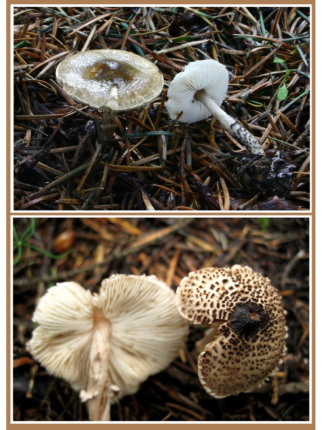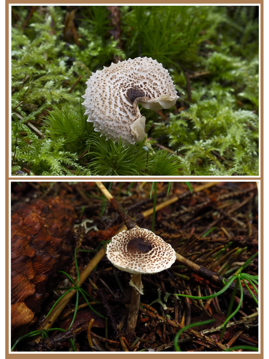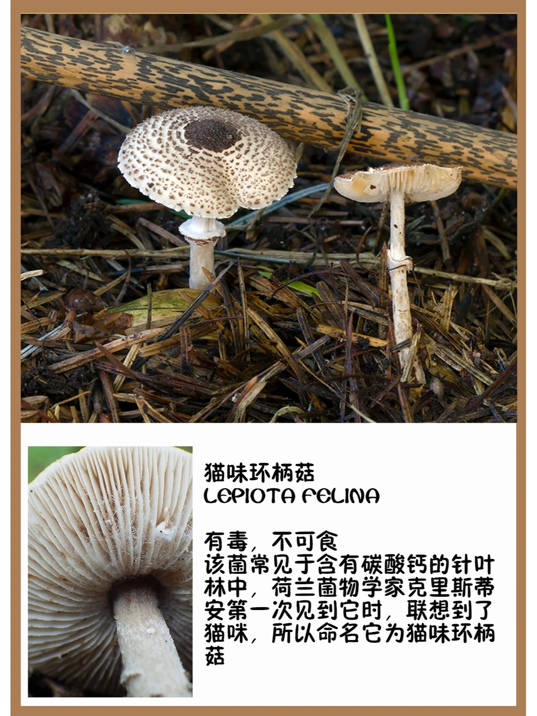 猫味环柄菇 Lepiota felina 有毒,不可食 该菌常见于含有碳酸钙的针叶林中,荷兰菌物学家克里斯蒂安第一次见到它时,联想到了猫咪,所以命名它为猫味环柄菇