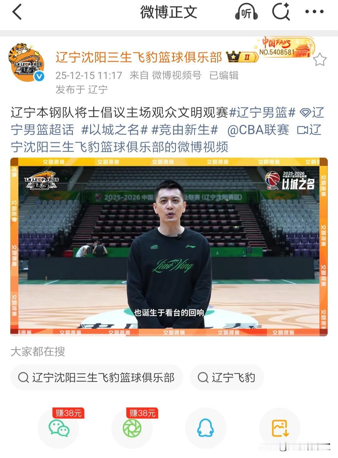 辽宁今天主场迎战广厦,俱乐部发布倡导球迷观赛视频,主教练杨鸣、赵继伟和威尔斯现身
