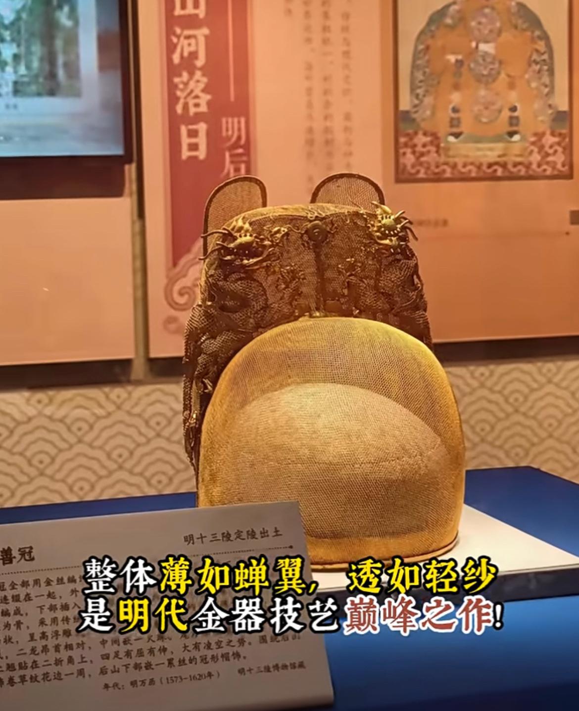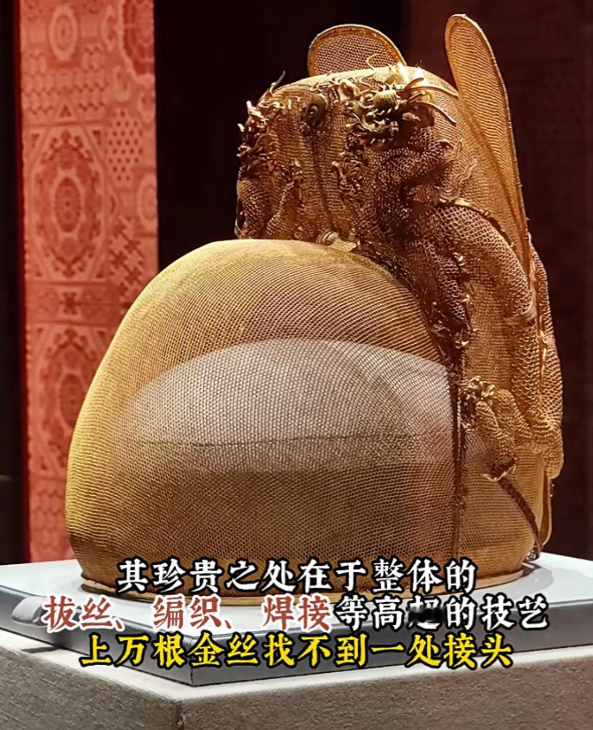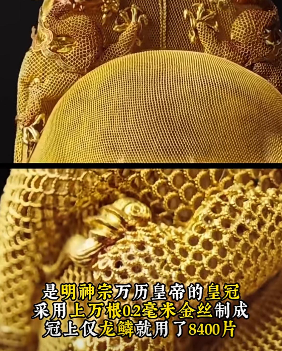 我国现存唯一的帝王金冠:金丝翼善冠,为明神宗万历帝皇冠,出土于明十三陵中的定陵。 金丝翼善冠巧技天成,鬼斧神工,上万根金丝找不到一处接头,为明代金器技艺的巅峰之作。