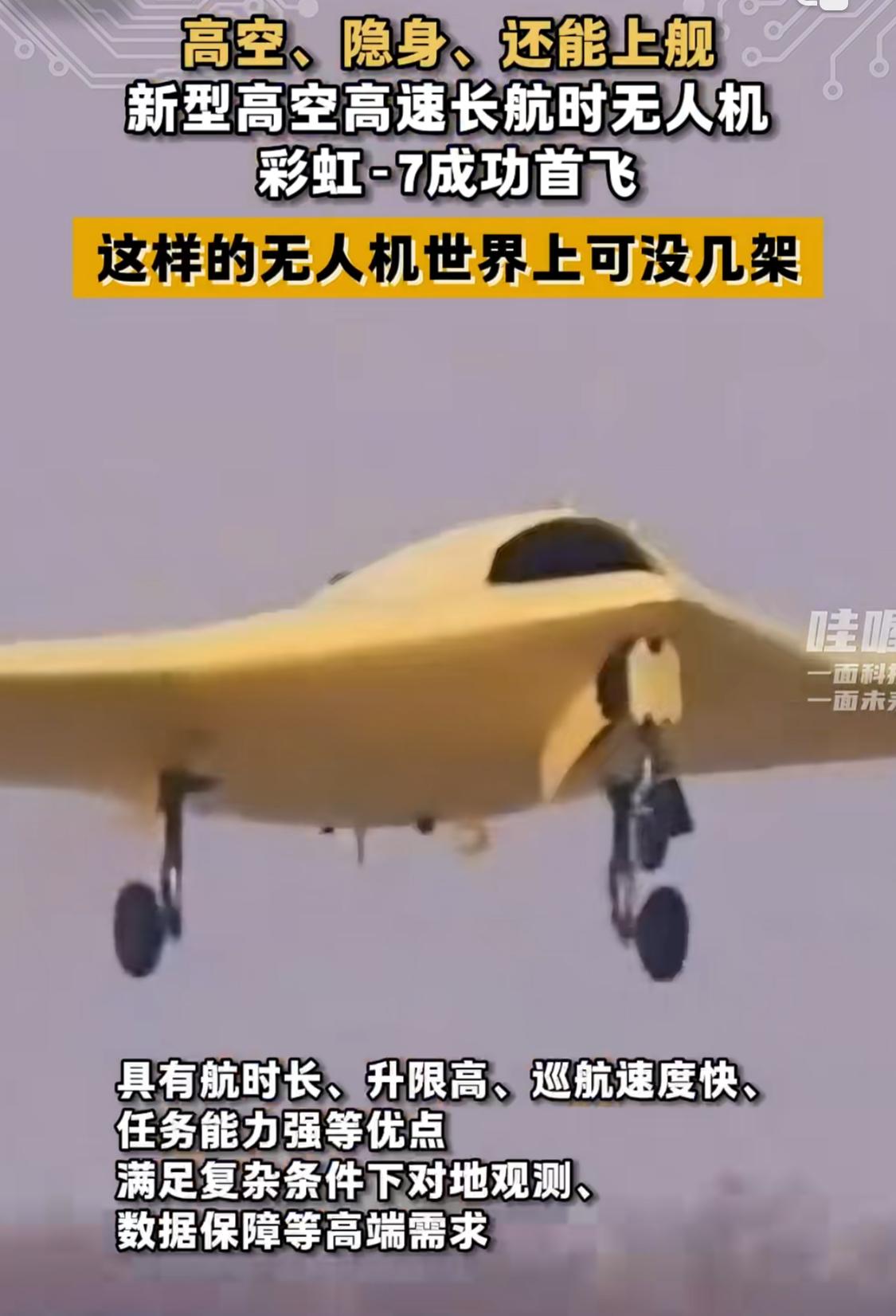 我国正式进入高端隐身无人机领域“第一梯队”,高空、高速、长续航、综合隐身、无尾飞翼式气动布局的察打一体无人机“彩虹-7”在近日成功首飞 这不光预示着我们成为继美国后第二个拥有如此实机的国家,更说明我们国家已完全攻克了高端无人机的各种难关,算是补齐了我国作战体系的关键一环。 你想啊,有此神器,在战时便可以先派它潜伏在敌方防空区域附近或内部,执行侦察、监视、目标指示等任务。若发现高价值目标,就实时通过数据链为后方的远程导弹提供精确制导……