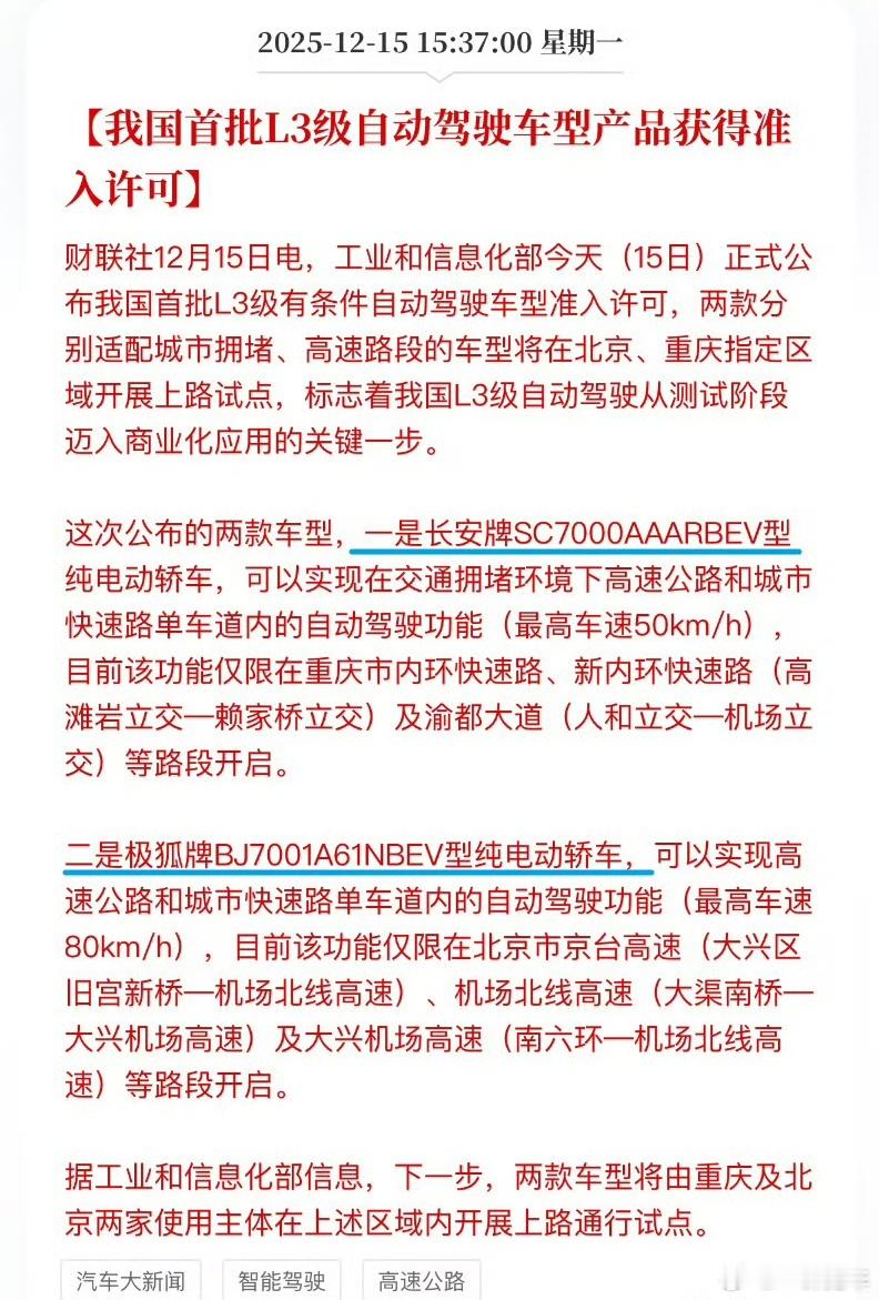 我国首批L3自动驾驶车型获准入许可车型清晰给到了,一辆长安、一辆极狐,其中北汽极狐这辆可以确定是用的华为ADS方案,并且上限比另一辆更高,可以在高速使用。这是L3自动驾驶落地的第1步,后续值得期待