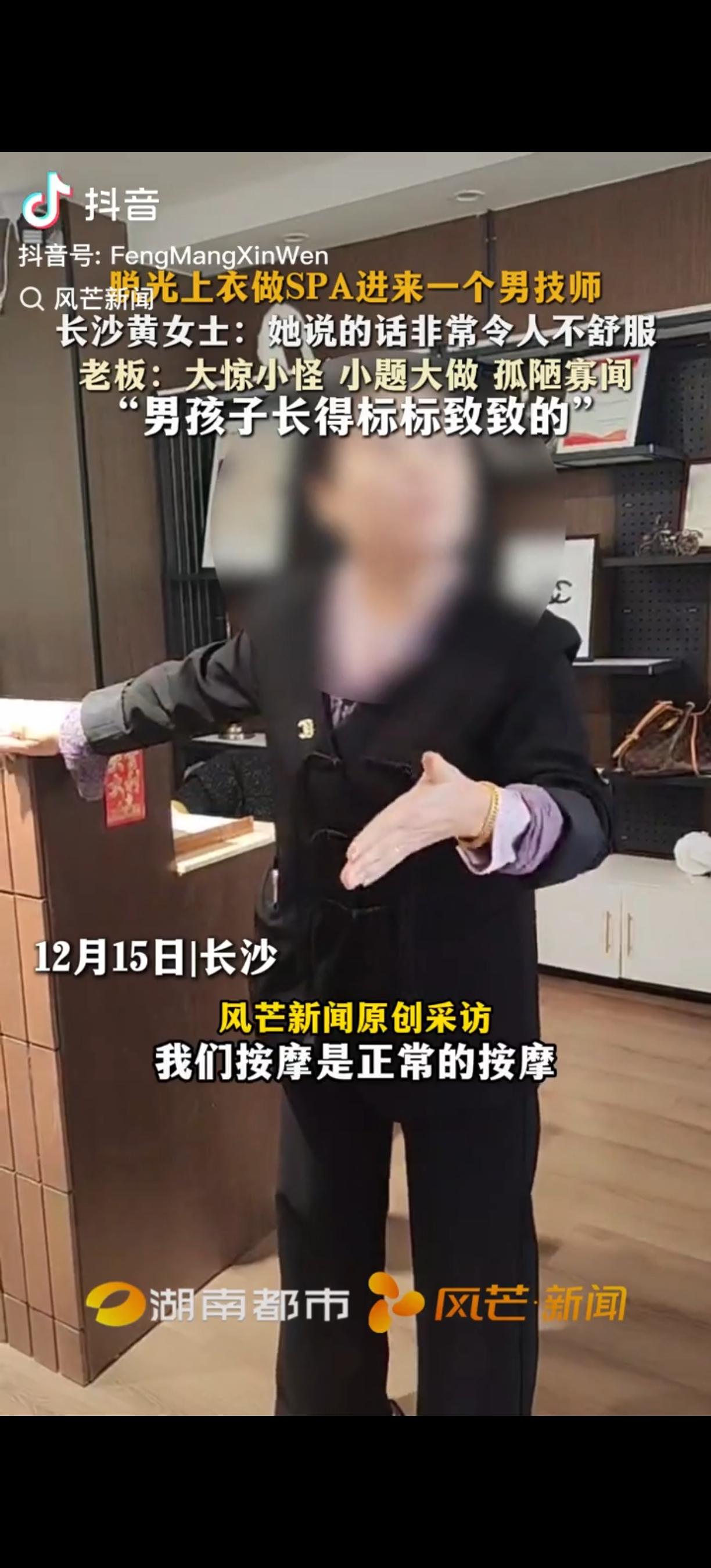 万万没有想到,湖南长沙,女子感到身心疲惫,就进了一家店,准备按一下摩,她脱光上衣,趴在床上,却突然听到男子的声音,她回头一看,居然是个标致的男技师,要给她进行接下来的项目,她吓了一大跳,当场拒绝,结果一个女店员却说她大惊小怪,小题大做,孤陋寡闻。 黄女士越想越气,自己来按摩是为了放松,结果搞出这么一档子事,店家不仅不觉得自己有错,还反过来指责她。她找到记者,把事情原原本本说了一遍,记者陪着她回到店里,想听听店家怎么说。 店里的女店员一见到她们,就开始辩解,说按摩是正常的,还强调店里是“绿色保健”,没搞什么乱七八糟的。她叉着腰,语气挺冲,说黄女士是自己想多了,男女技师都一样,还说男技师“长得标标致致”,二十来岁,看不上黄女士,意思是黄女士没必要大惊小怪。 黄女士听到这话,气得不行,反驳说男技师再年轻,也是个异性,自己脱光上衣趴在那,突然进来个男的,任谁都会害怕。而且店家事先根本没问过她要不要男技师,这是侵犯了她的知情权和选择权。 女店员却觉得黄女士是在小题大做,还说自己只是打工的,店不是她的,要是她是老板,当天就把200块钱退给黄女士了。最后,她才不情不愿地道歉,说下次会先问顾客要不要男技师,不要的话就安排女技师。 可黄女士心里还是不舒服,她觉得店家的态度从一开始就有问题,不是一句道歉就能解决的。这件事也提醒大家,在消费的时候,遇到不合理的情况,一定要维护自己的权益,不能让不良商家钻了空子。 各位读者你们怎么看?欢迎在评论区讨论。 来源:风芒新闻 2025-12-15消息