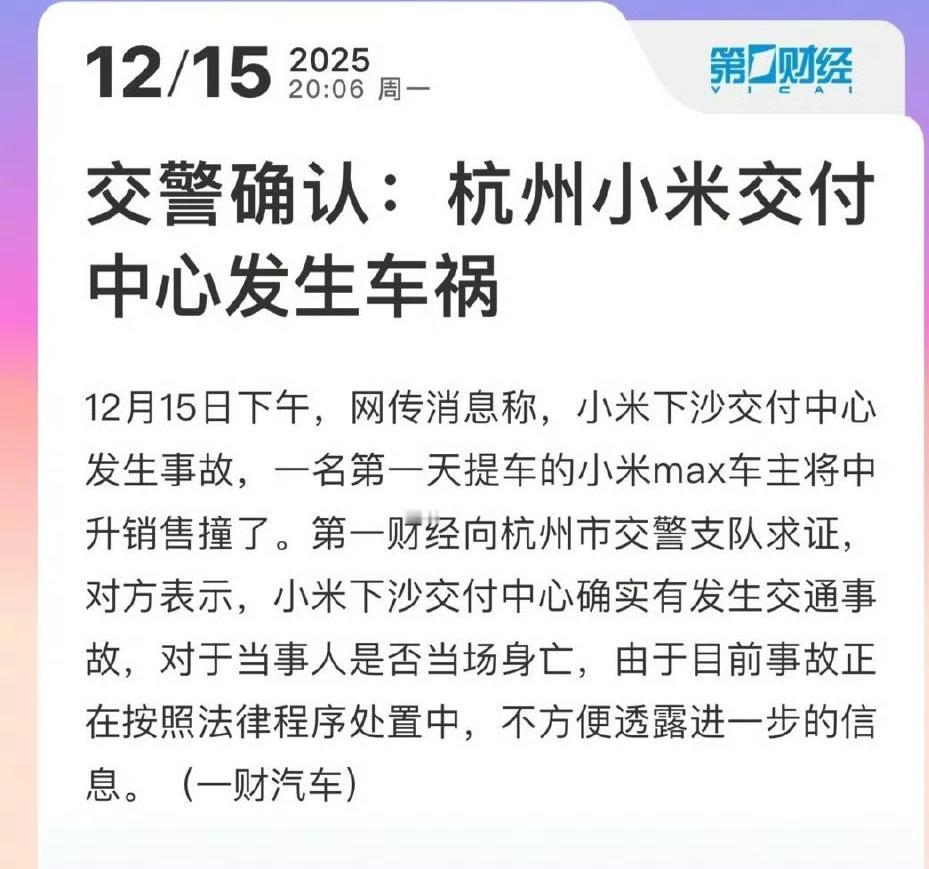 杭州小米交付中心出事!提的新车没出园区就撞人,现场揪心,警方已介入。 真是太揪心了!12月15日下午,杭州梦马汽车小镇的小米交付中心出了大事,一位刚提了小米新车的车主,还没把车开出园区,就撞倒了园区里的工作人员。 据目击者说,当时车主倒车的时候,蹲在墙角的工作人员夏某被车撞到,车子明明一开始速度很慢,突然就猛地加速,才酿成了意外。现场视频里能看到,被撞的人躺在地上,周围有人赶紧做心肺复苏,随后交警和急救人员也赶到了现场抢救。 红星新闻核实后确认,被撞的夏某是园区内中升杭州汽车维修服务公司的员工,而第一财经也向杭州交警求证,对方也证实了小米下沙交付中心确实发生了交通事故,只是事故具体原因和伤者情况,还在等待交警部门的调查结论,暂时不便透露更多信息。 新车刚提就出这样的事,不管是对于车主还是伤者家属来说,恐怕都难以接受。目前事故还在进一步处理中,希望能尽快查清事故原因,也愿伤者能平安无事。小米汽车出事故 小米车车祸 小米撞人事件 小米车祸现场 小米 小米汽车