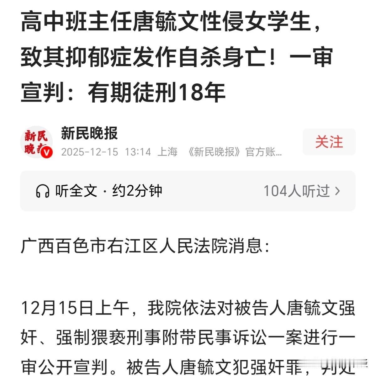 广西百色,22岁女学霸重度抑郁,选择轻生,三位堂姐清理她的遗物,从日记本里发现惊天秘密,她15岁时被班主任长期性 侵,还被言语恐吓,受尽了委屈。在班级群里当众讨要说法,可群转眼就被解散,满肚子的绝望无处诉说,最后才走上绝路。三位堂姐咽不下这口气,拼尽全力举报维权,施暴老师最终被严惩,女孩也算能安心了! 2025年12月15日,唐毓文因强 奸罪、强制猥 亵罪被判18年有期徒刑,终身不能从事未成年教育行业。 法庭外,符月华的三位堂姐哭到直不起腰,一遍遍念叨:月华,坏人遭报应了,你可以安心了。 这一切要从2025年1月17日说起,一通急促的电话,说22岁的表妹符月华,在家烧炭自 杀了。 简月华2002年出生,当年可是全县中考第一,凭着真本事考上了百色祈福高级中学。 三姐妹放下电话,赶到表妹家,屋里满是哭红了眼的亲属,大家都接受不了现实。 三位堂姐帮忙整理表妹的遗物,这是表妹留下的一些念想,每一样都格外沉重。 然而,从简月华的日记本里,发现了惊天秘密,她15岁被班主任唐毓X侵。 符月华从小父母离异,她乖巧懂事,三位堂姐一直把她当亲妹妹疼。 看着她努力读书,考上重点高中,没人知道,从2017年9月她上高一,就被唐毓文拖进了泥沼。 谁能想到,这个优秀班主任表面光鲜亮丽,背地里竟干着如此龌 龊的事,简直禽 兽 不 如。 发脆的日记纸页上,字字都是绝望;旧手机和电脑里的聊天记录,更是看得三位堂姐火冒三丈,浑身发抖。 从2017年到2021年,整整四年,唐毓文总以补课谈心为借口,在办公室、私家车,一次次对她实施侵害。 简月华反抗,要举报,班主任却天天拿“毁你名声”“没人会信你”威胁她。 更过分的是,时不时发些露骨信息,一个单纯的小姑娘承受不住屈辱。 直到这时,大家才明白,为啥符月华高二后成绩突然下滑,为啥会偷偷自 残。 2019年确诊重度抑郁症也根本不是啥青春期叛逆,全是被这桩丑事熬出来的心病。 2020年高考前,她竟狠心撕了准考证放弃考试,那得是承受了多少绝望多委屈。 好在她重新振作,2021年复读后,凭着一股不服输的劲,考了628分,成了县理科状元,考上理想大学。 本以为上了大学就能远离噩梦,可那些阴影早就刻进了骨子里,怎么也甩不掉。 2021年10月,符月华被查出“伴精神病性症状的重度抑郁发作”,只能休学治病。 2022年10月,病情越来越重,发展成了精神分裂症。到2023年9月,她实在撑不下去,只能退学回家。 走投无路,她在高中毕业群里指责唐毓文表里不一,唐毓文直接解散了群。 委屈没处诉,悲痛熬不住,曾经的学霸没抗住,走上不归路。 悲痛过后,三个堂姐打定主意,一定要让坏人付出代价。 她们都是普通上班族,不懂法,就把日记关键页复印下来,手机电脑里的聊天、通话记录也全备份好。 找律师咨询,把日记、医疗记录、自残照片、同学证言全都整理妥当,凑成了扎实的证据链。 2025年2月10日,在专业人士指导下,她们写了实名举报信,附证据截图发上网。 没想到一夜之间就爆了,话题冲上热搜,网友热议,舆论推着事件进展。 第二天,相关部门组成联合工作组联系了她们。 之后,三位堂姐反复跑工作组,一遍遍说表妹的遭遇、交补充证据,想起表妹当初求助无门的样子,说着就哭了。 维权的路不好走,有人劝她们算了,说女孩子名声要紧,还有人背后说她们炒作博眼球。 更气人的是,庭前会议上唐毓文先认了罪,想拿10万私了,被拒后就全翻供了,那副嘴脸让人恶 心。 看着表妹的日记,想起她受的苦,三位堂姐从没动摇,就想替表妹讨个公道。 2025年11月30日,法院对案子进行了不公开审理。 12月15日,一审公开宣判。唐毓文把符月华的自杀归咎于“家庭离异背景”,只肯承认强制猥 亵,死活不认侵犯。 好在证据扎实,司法鉴定也确认唐毓文侵害加重了符月华的病情,他的狡辩没用。 《刑法》第236条,以暴力、胁迫或者其他手段强奸妇女的,处三年以上十年以下有期徒刑;强奸妇女、奸淫幼女情节恶劣的,处十年以上有期徒刑、无期徒刑或者死刑。负有特殊职责的人员性侵未成年人的,从重处罚,致被害人精神损害、自残自杀的,认定为情节恶劣 。 唐毓文作为班主任,对未成年学生负有教育看护职责,却以补课为由,长期对简月华实施X侵。 还以毁名声相胁迫,属于利用特殊职责实施犯罪,依法应从重处罚。 其性侵行为直接导致符月华患上重度抑郁,与其轻生有直接关系。 最终唐毓文数罪并罚被判18年,剥夺政治权利5年,终身不能从事未成年人相关工作,还要赔偿符月华父母经济损失。 对此,你怎么看呢?