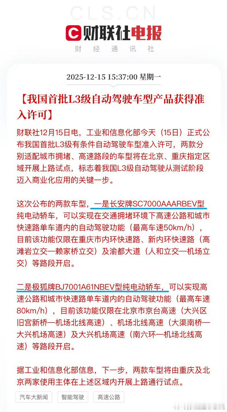 两家车企获批开展L3试点。两家L3有且只有华为智能驾驶系统。真是两岸猿声啼不住,轻舟已过万重山。