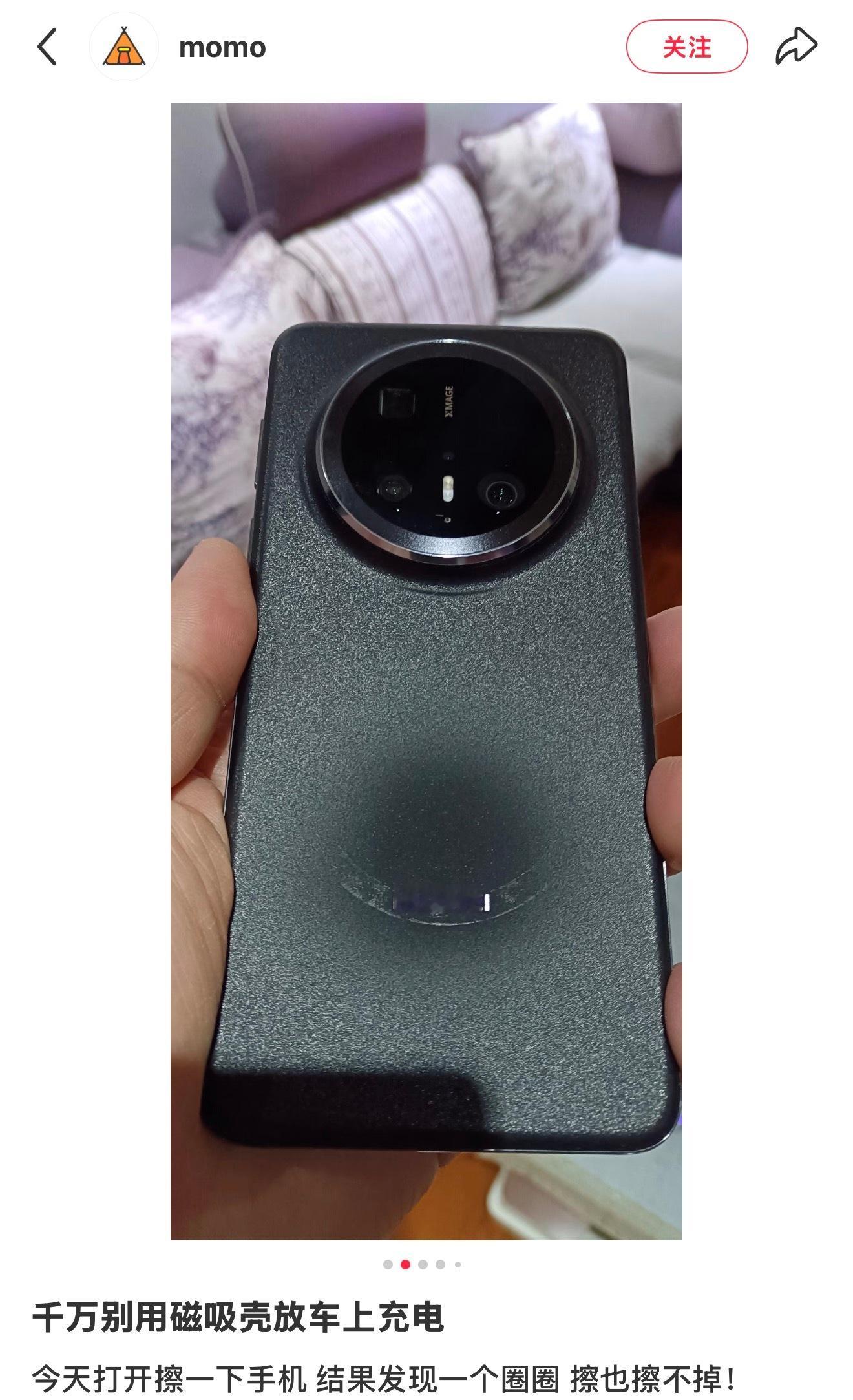 玻纤后盖的手机,特别是黑色,用磁吸壳留印子这个情况不少见。为什么磁吸壳会给玻纤后盖留下印记?最主要的原因是磁圈的麦拉高出的壳子背部平面,壳子一套,背部就是麦拉充分接触玻纤后盖,塑料跟塑料在一起摩擦,或者充分接触产生挤压,麦拉的胶层溢出跟玻纤融合在一块了,不出现印子才奇怪。而且黑色玻纤磨出来印记比浅色明显。三个建议:1,不要用磁吸壳,不要用硬壳子。要用磁吸壳也要选磁圈麦拉跟壳子平着或者低于壳子平面的。不要磁吸壳能不能幸免?不能。因为有的壳子背部不是与玻纤后盖完全隔开的,有几个点接触到玻纤后盖,摩擦,必定会有印记。2,用内部是软性超纤的壳子,但也不一定能幸免。因为有的壳子超纤会掉色,掉色也可能沾染到浅色玻纤后盖上面。3,不要选玻纤后盖的手机。