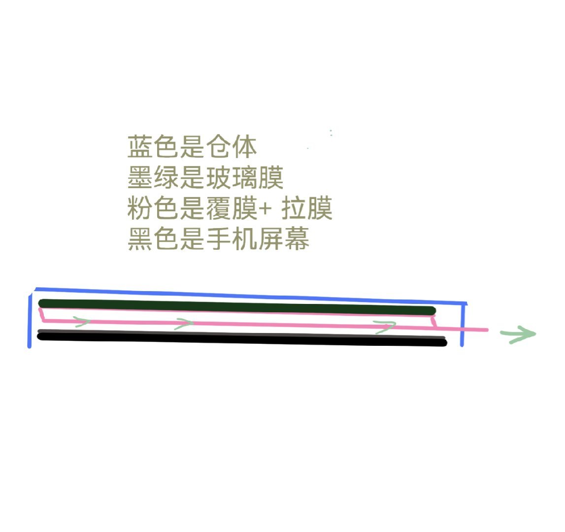 无尘仓的大概结构是这样,一个仓体,仓体就相当于定位框神器。然后玻璃膜表面覆膜后与仓体固定连接。玻璃膜底胶面再覆盖一层膜,这个膜是两张连着的,一张贴在玻璃膜底胶面,另一张是活动的充当拉膜。朝箭头方向拉动拉膜后,使覆盖在玻璃膜上面的那一层膜脱离,然后一直拉动直到完全把覆膜拉出来。覆膜+拉膜这一张连在一起的膜在玻璃膜和手机裸屏之间做 X 或 Y 轴方向的运动。刮花屏幕都风险就出现在这个拉膜的操作,膜与手机屏幕有一个 X 轴的相对运动,拉模+覆膜与裸机屏幕上面有颗粒状的灰尘没除干净的话就有可能刮花屏幕。所以无尘仓很厉害都地方就是让贴膜变得更直观便捷,盖上无尘仓,拉一下就贴好了。而用定位框神器贴膜,需要清理干净灰尘,神器上的灰尘、贴膜上的灰尘等等,然后还有撕开覆膜再放进框内。神器定位框贴膜为什么不会刮花屏幕呢,因为贴膜放下是 z 轴方向的运动,哪怕屏幕上有颗粒,贴膜与手机没有 xy 轴相对运动就摩擦不到屏幕,除非人为故意去搓动贴上去屏幕上面的膜。