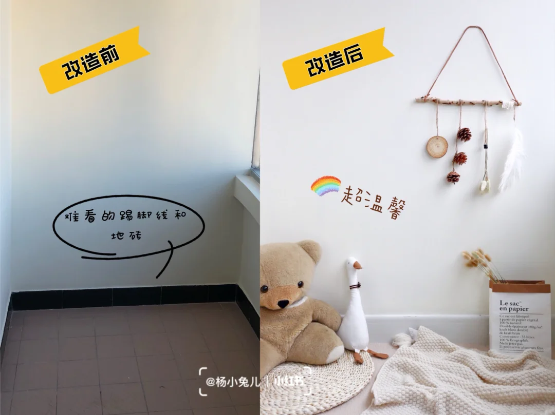 原来我家是黑色踢脚线加瓷砖地,特别土是不是…阳台改造最重要的是整体颜色和风格,我选择了米色地毯+白色踢脚线,先让空间“白净”起来,然后再布置其他道具。地毯和踢脚线需要自己动手改造,踢脚线自带背胶,地毯可以用热熔胶固定。