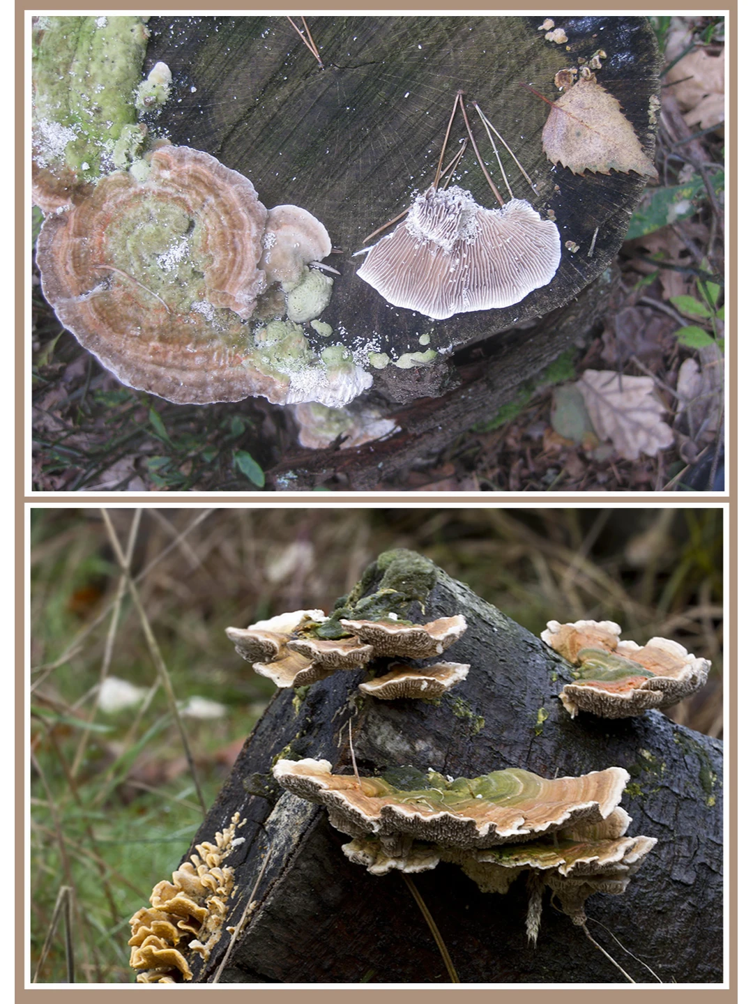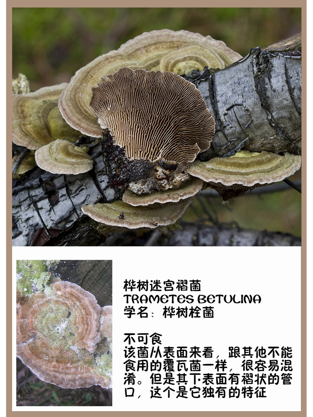 桦树迷宫褶菌 trametes betulina 学名:桦树栓菌 不可食 该菌从表面来看,跟其他不能食用的覆瓦菌一样,很容易混淆。但是其下表面有褶状的管口,这个是它独有的特征