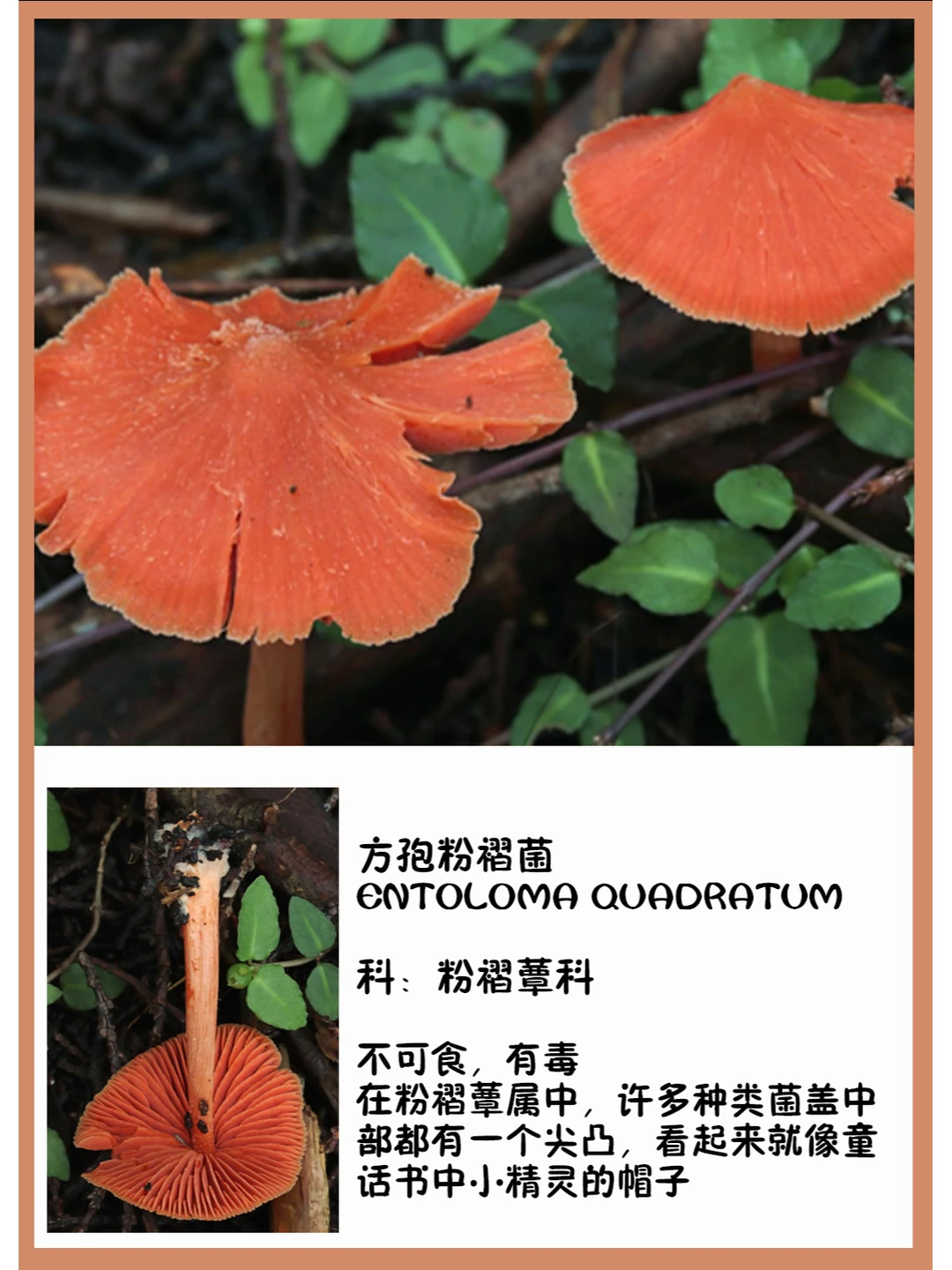 方孢粉褶菌 Entoloma quadratum 科:粉褶蕈科 图片©manatarka.org ©josef hlasek ©oso 不可食,有毒 在粉褶蕈属中,许多种类菌盖中部都有一个尖凸,看起来就像童话书中小精灵的帽子[色色R] 方孢粉褶菌看起来可爱,却是粉褶蕈属中毒性最强的物种之一[石化R]