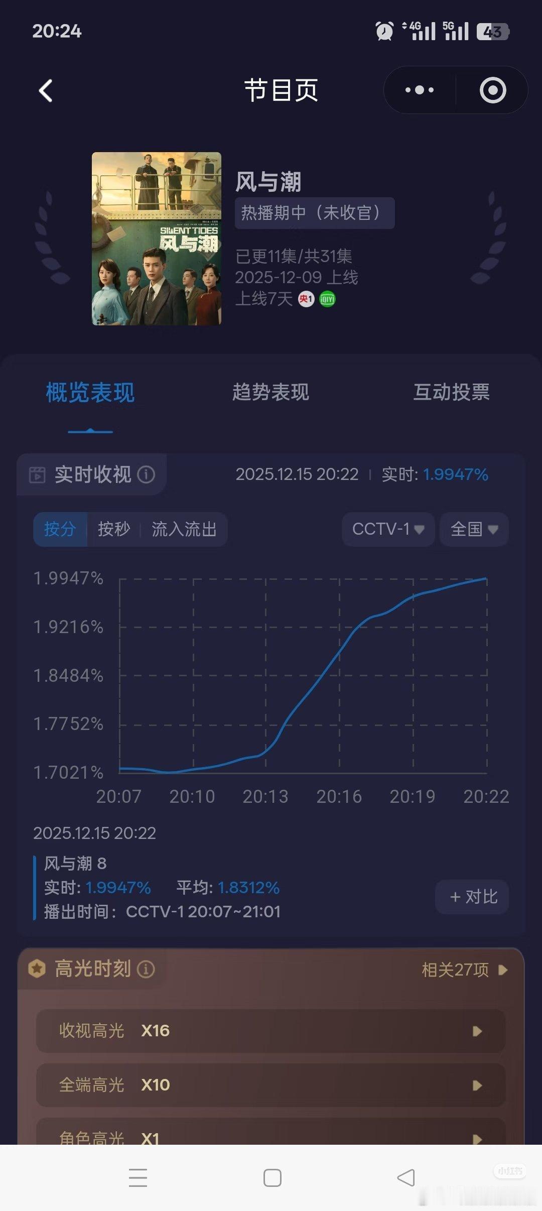 电视剧风与潮断更两天,今天复更,拉升好牛,峰值破2了!电视剧风与潮