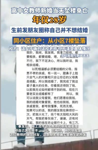 结婚当天,新娘从7楼一跃而下。 河南一位高中女教师,在父母亲戚催婚了11年后,终于妥协办婚礼。结果在结婚当天,从自家七楼跳了下去。 你发现没,我们好像把结婚当成了一场“毕业典礼”。考上了好大学,家长说等毕业就好了;找到了好工作,亲戚说等结婚就好了。似乎只要完成这个仪式,人生就能自动切换成幸福模式,所有问题都会迎刃而解。没人关心你毕业论文写得痛不痛苦,也没人关心你找的这份工作开不开心,他们只在乎那张毕业证和结婚证什么时候能拿到手。 这根本不是催婚,这是把一个人的人生价值,粗暴地压缩进一场婚礼里。一个能从学生努力到优秀教师的人,她的价值难道需要用一场婚礼来认证吗?一个能规划自己十几年学业事业的人,她难道没有能力判断自己什么时候该进入婚姻吗?催婚催到最后,好像她前面二十多年的所有努力和成就,都只是为了给这场婚礼当个入场券。 最残忍的是,他们用“为你好”的绳子勒紧你,还嫌你喘气的声音不够动听。 别再把婚礼当成人生的颁奖礼了。真正的幸福,从来不是一场盛大的表演,而是台下那个不必伪装的笑容。