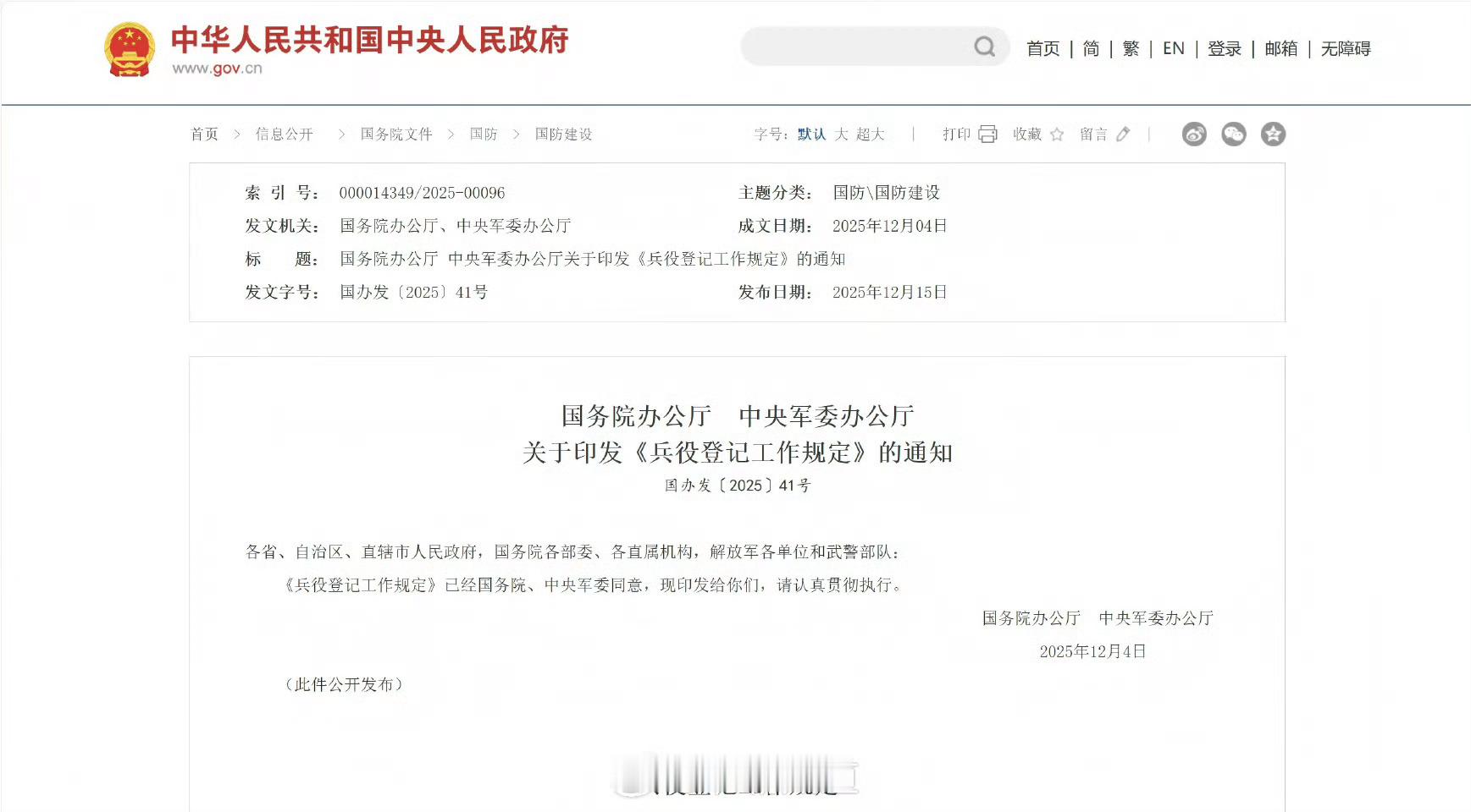 【国务院办公厅、中央军委办公厅印发《兵役登记工作规定》】新华社北京12月15日电